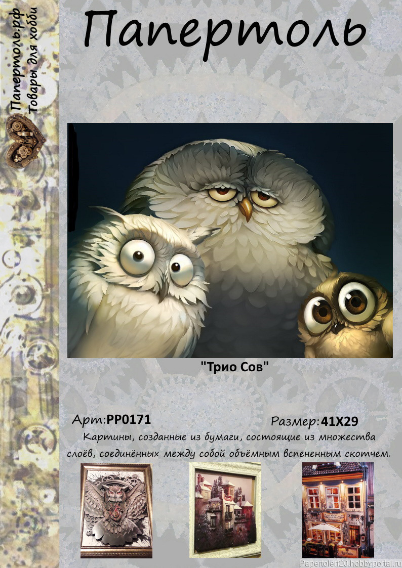 Папертоль "Трио Сов", р.29*41 ручной работы на заказ