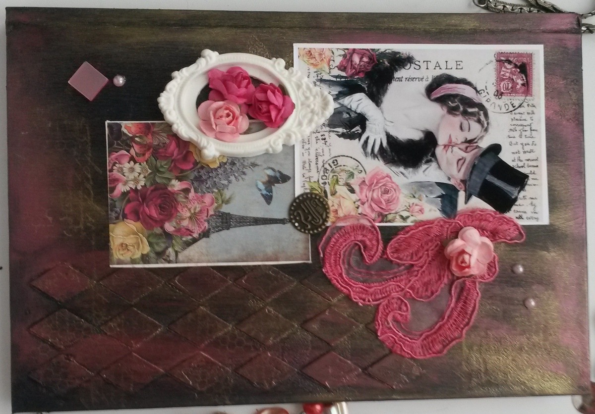 картон, бумага для скрапбукинга, кружево эластичное, краски акриловые, контуры акриловые, бусины под жемчуг, картинка