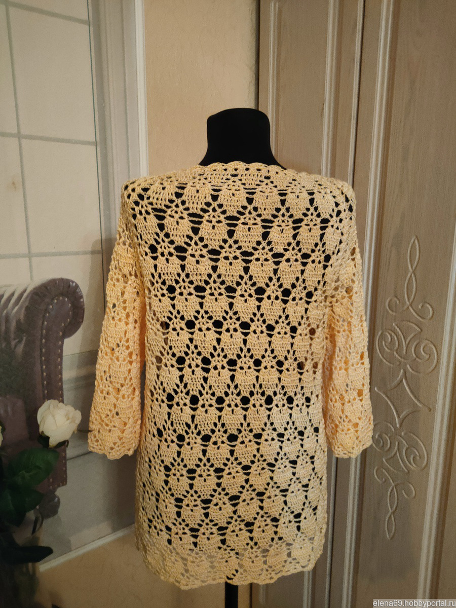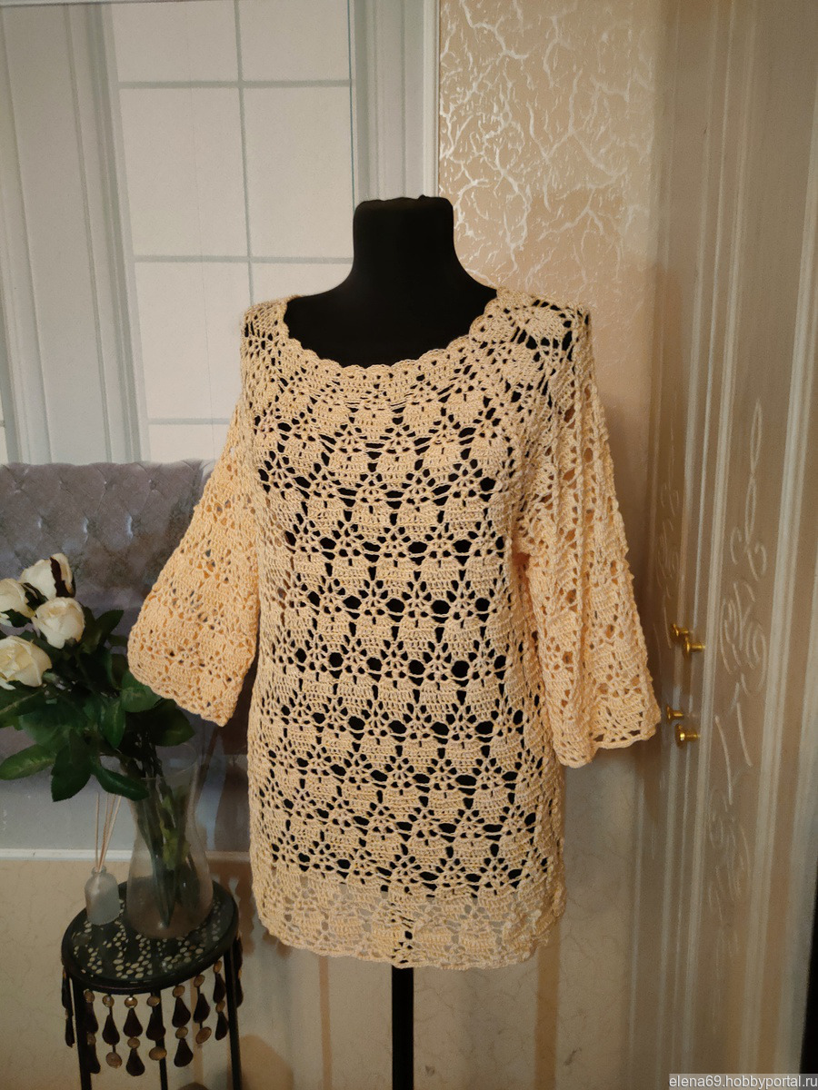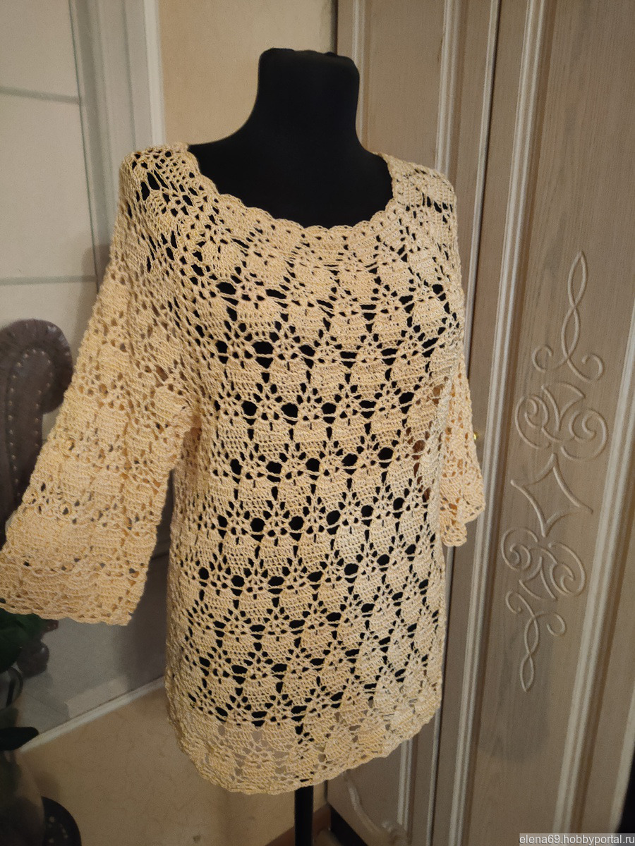 Нарядный пуловер цвета шампанского связанный крючком из вискозного шелка.