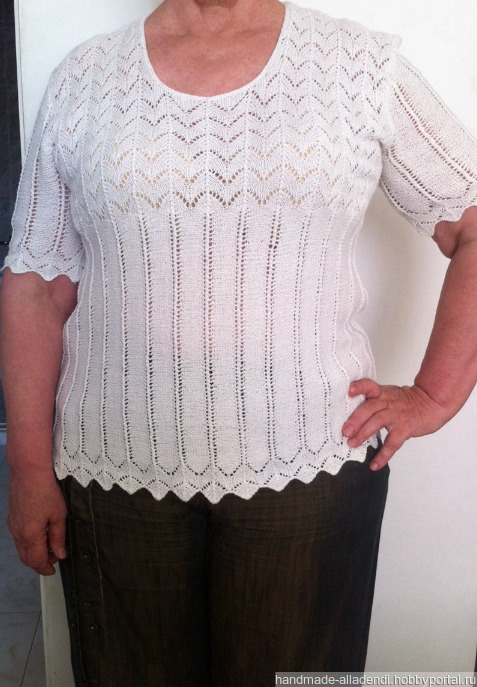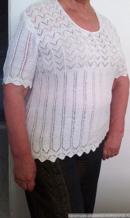 Вязаный универсальный джемпер с круглой горловиной.Удобная и комфортная модель для лета из итальянской хлопковой пряжи с актуальным сейчас рисунком длина 70см на 50 размер.Ручная вязка