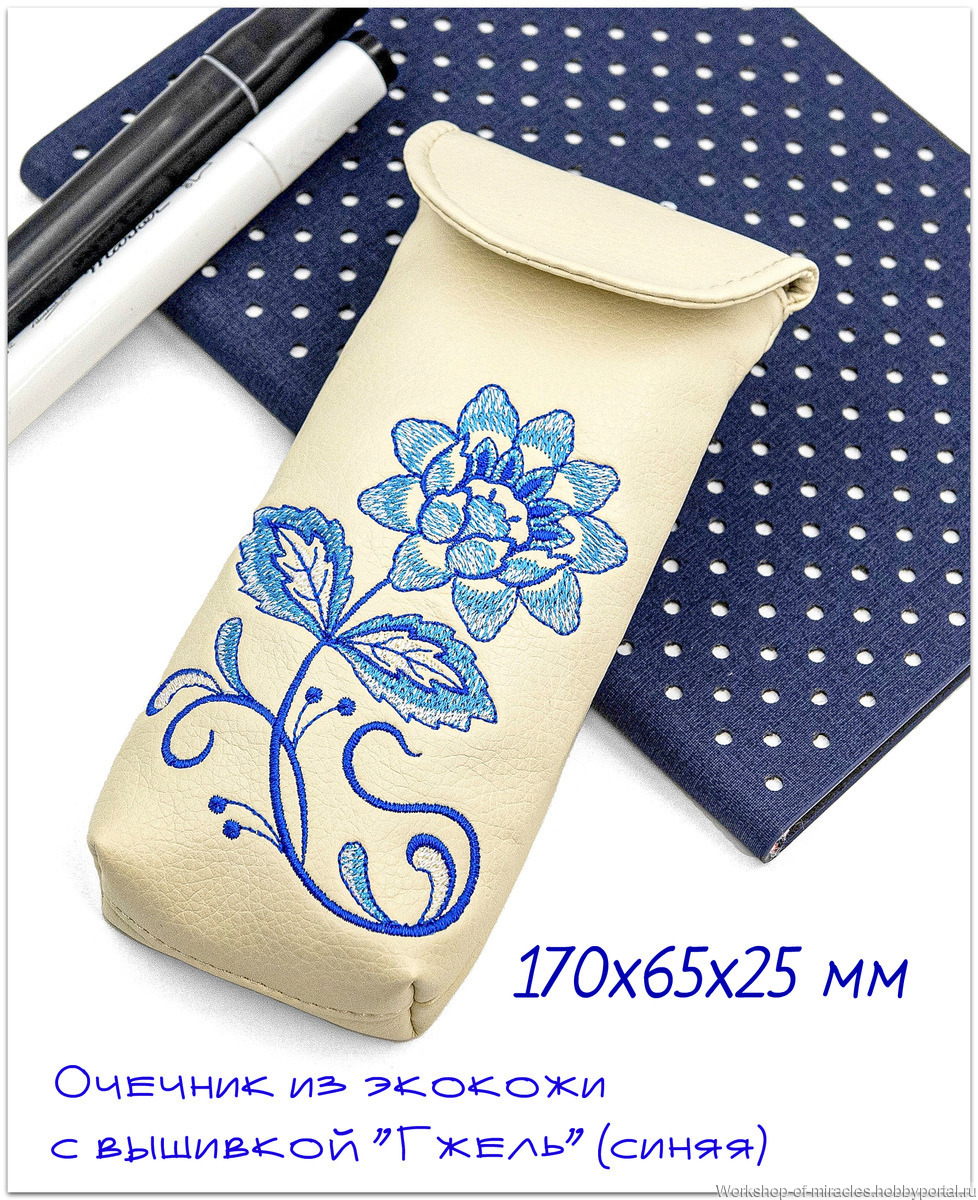 Очечник с верхом из эко-кожи и подкладкой их атласа, с небольшим клапаном и застежкой - магнитной кнопкой, отделка - вышивка.