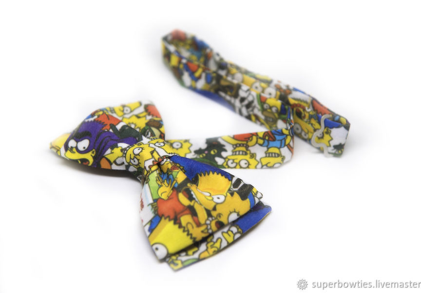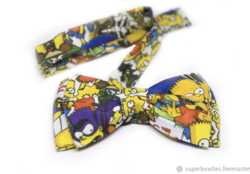 Галстук-бабочка Симпсоны выполнен из хлопка. Длина шейной ленты регулируется. Застежка металлическая.