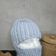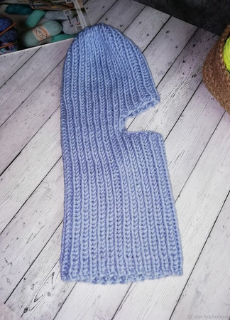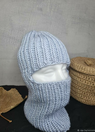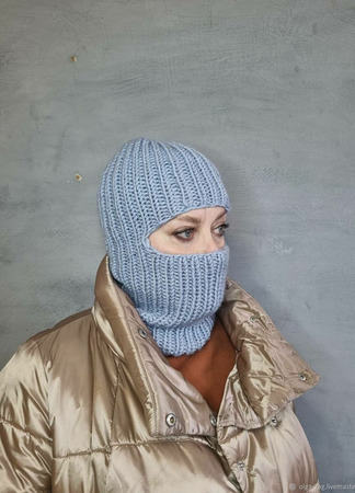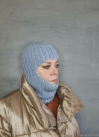 балаклава из голубой полушерсти (Турция), связана крупной вязкой, подходит голубоглазым и сероглазым людям; мягкая, неколючая, простая и удобная в носке