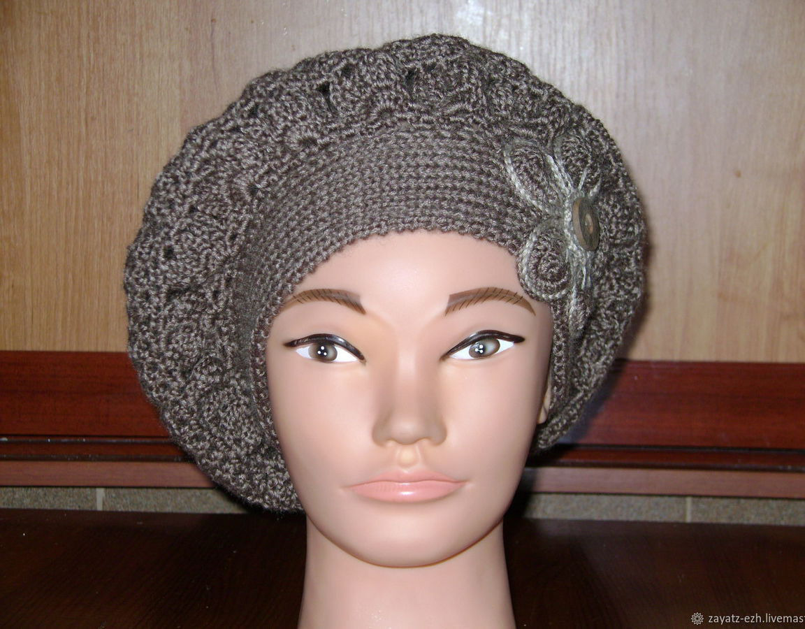 берет, шапка вязаная, берет крючком, коричневый, берет вязаный, берет женский, полушерсть, головной убор вязаный