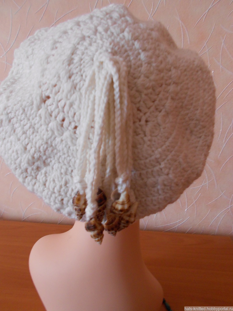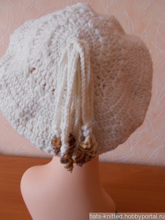 Изделие связано вручную крючком из высококачественной пряжи, при носке не колется, не спадет на лоб, украшен ракушками, косички с ракушками съемные.