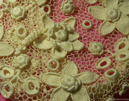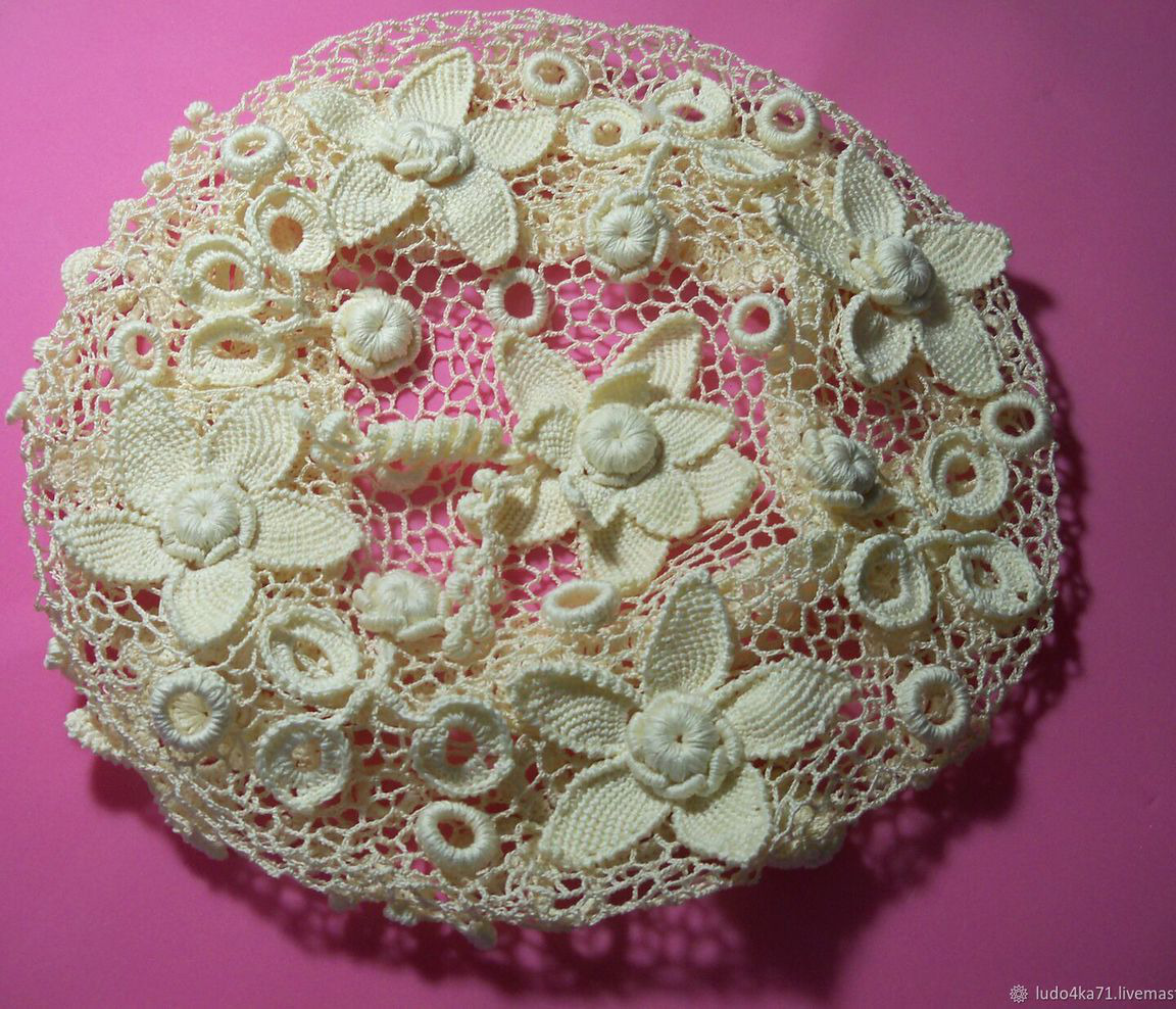 Берет выполнен в технике ирландское кружево,все мотивы выполнены отдельно и соединены нерегулярной сеточкой.В таком берете вам не будет жарко летом и не напекёт голову,так как он выполнен из молочного цвета! размер 56-58 по краю можно вставить шнурочек для убавления размера.
