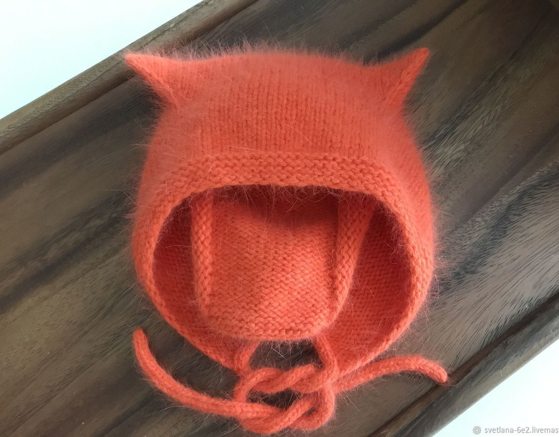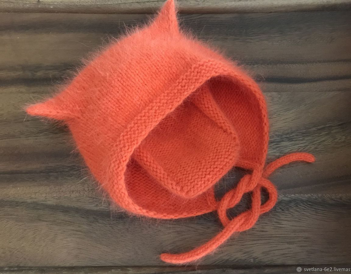 подарок девушке, шапка с ушками, чепчик вязаный, котошапка, чепчик спицами, чепчик с ушками, женский чепчик