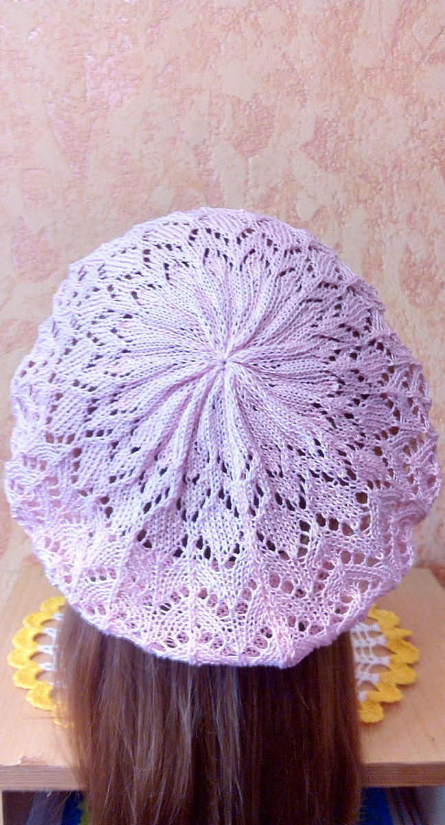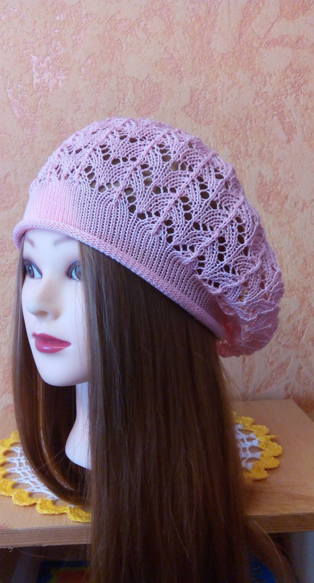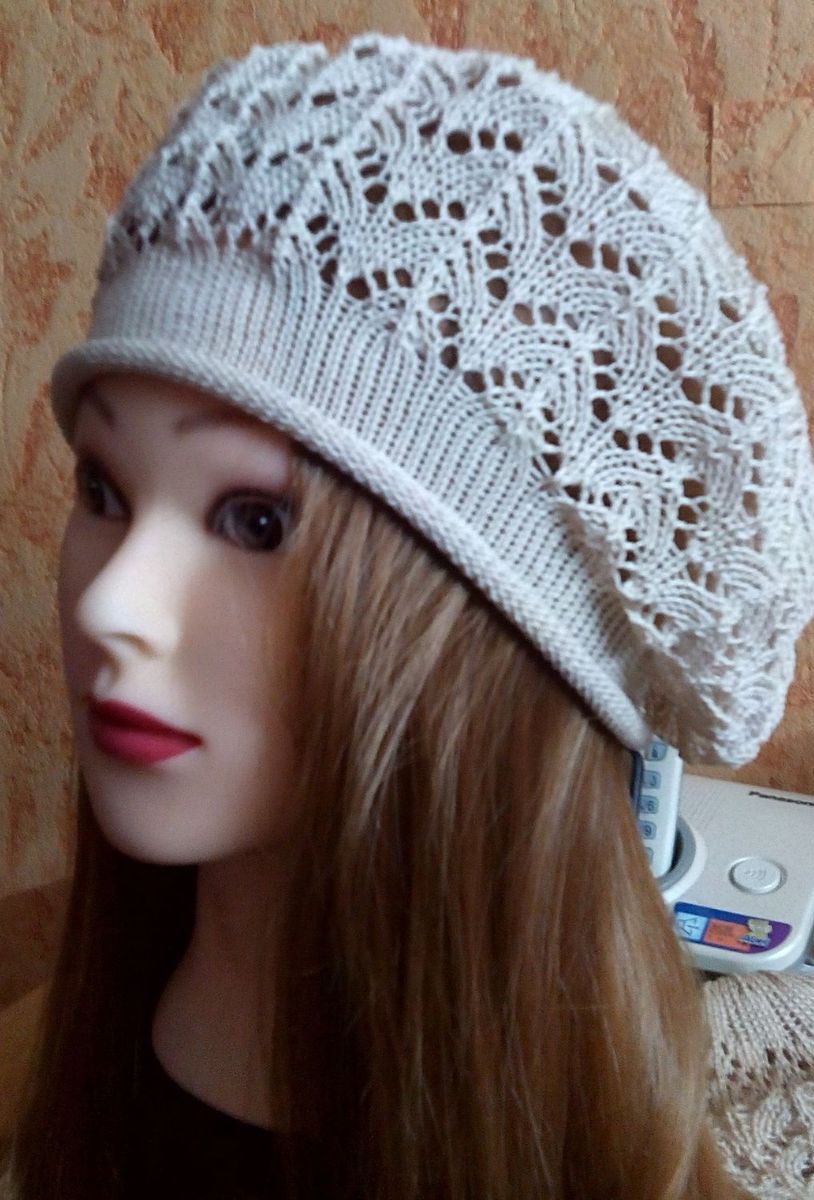 однотонный, белый, берет вязаный, ажурный узор, летний берет, машинное вязание