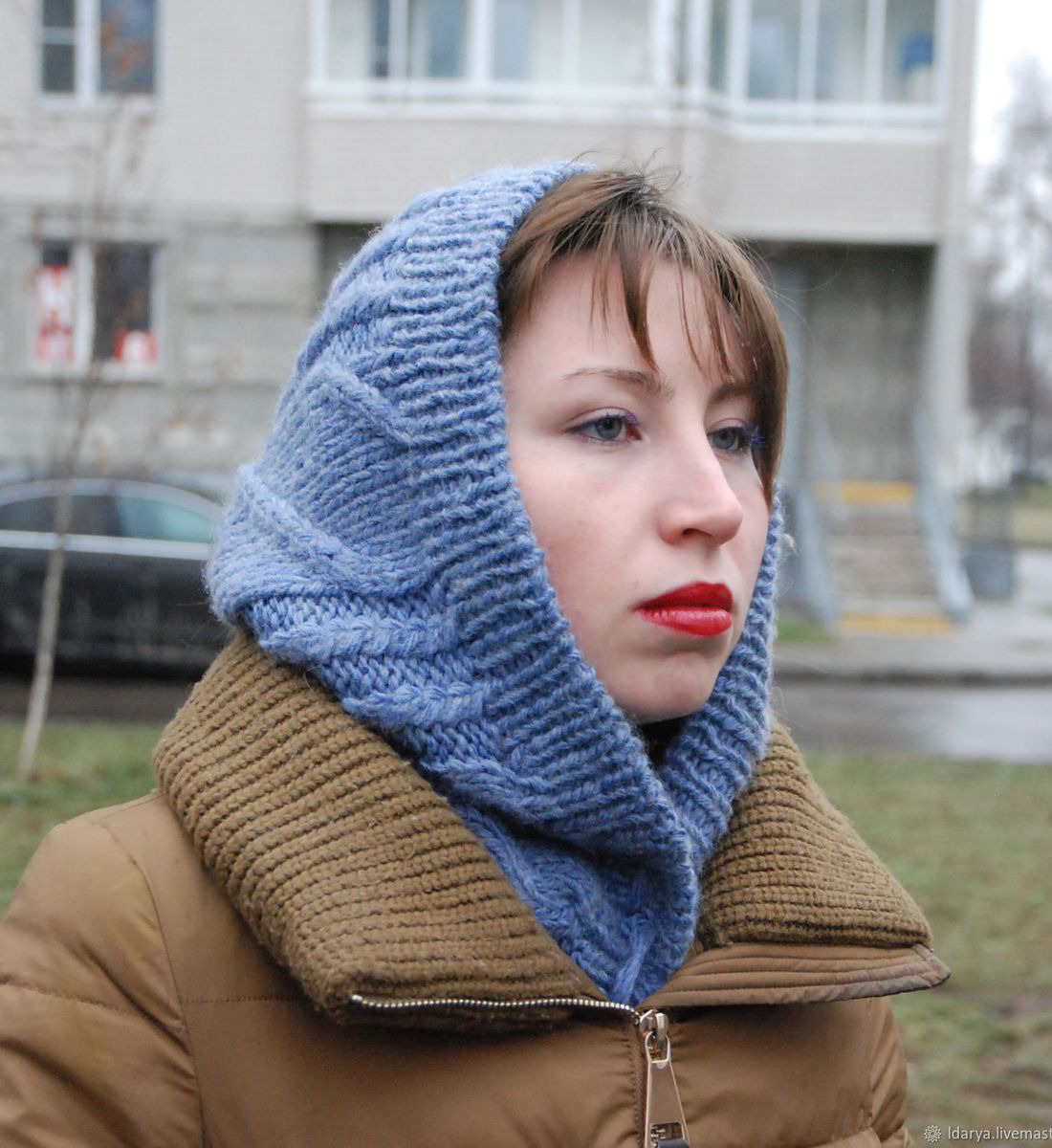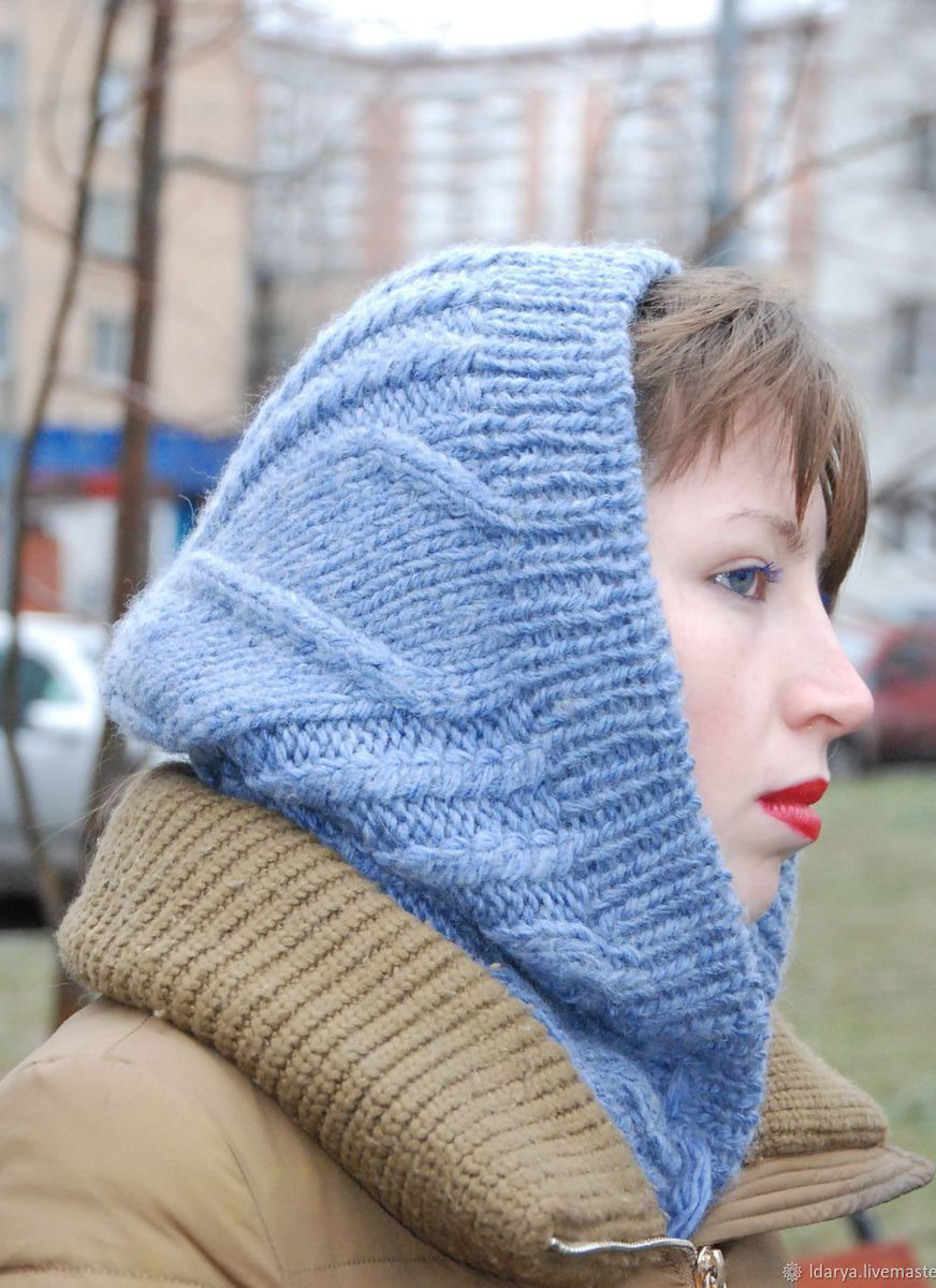 Капюшон связан на спицах из полушерстяной пряжи. Стильный и удобный.
