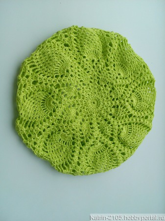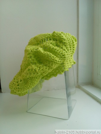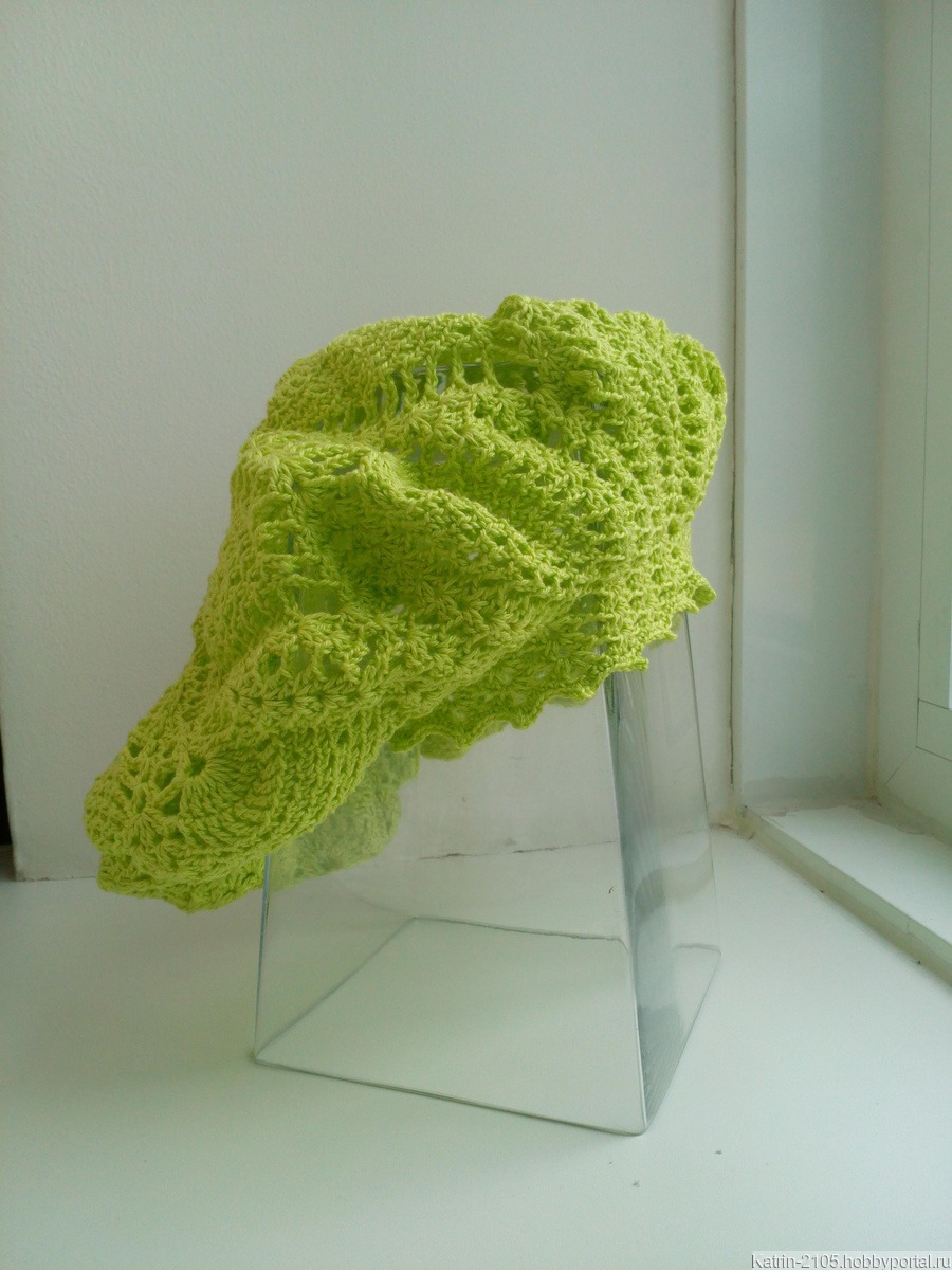 Летний воздушный беретик необходим любой женщине, девушке. Он защищает голову от жаркого солнышка. Предлагаю вашему вниманию одну из первых моих работ - летний беретик цвета свежей зелени. Вязала его сама крючком из ниток Ирис. Получился, на мой взгляд, очень нежный, ажурный. Дырочки позволяют голове дышать, а хлопок идеально подходит для защиты от зноя.