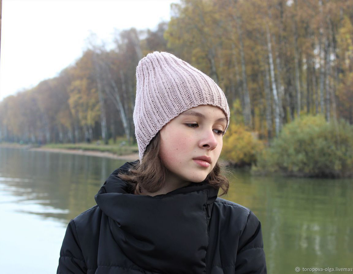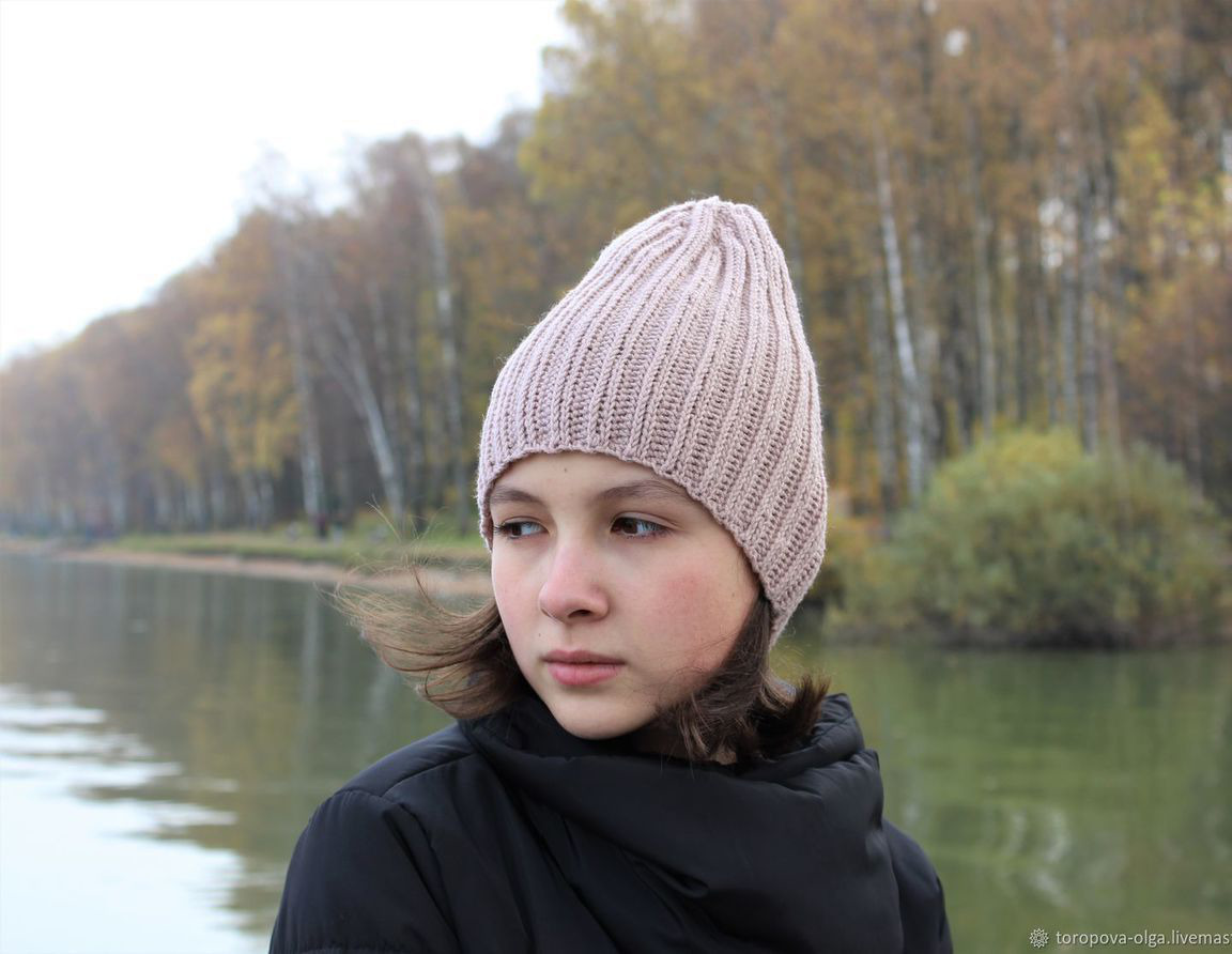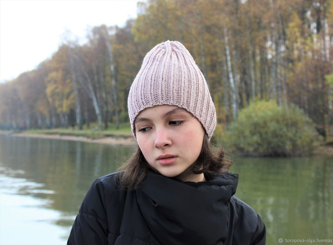 Стильная лаконичная шапочка с высокой макушкой связана из высококачественной теплой пряжи.