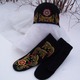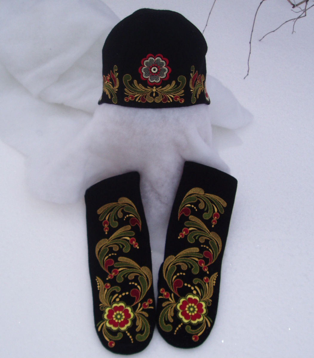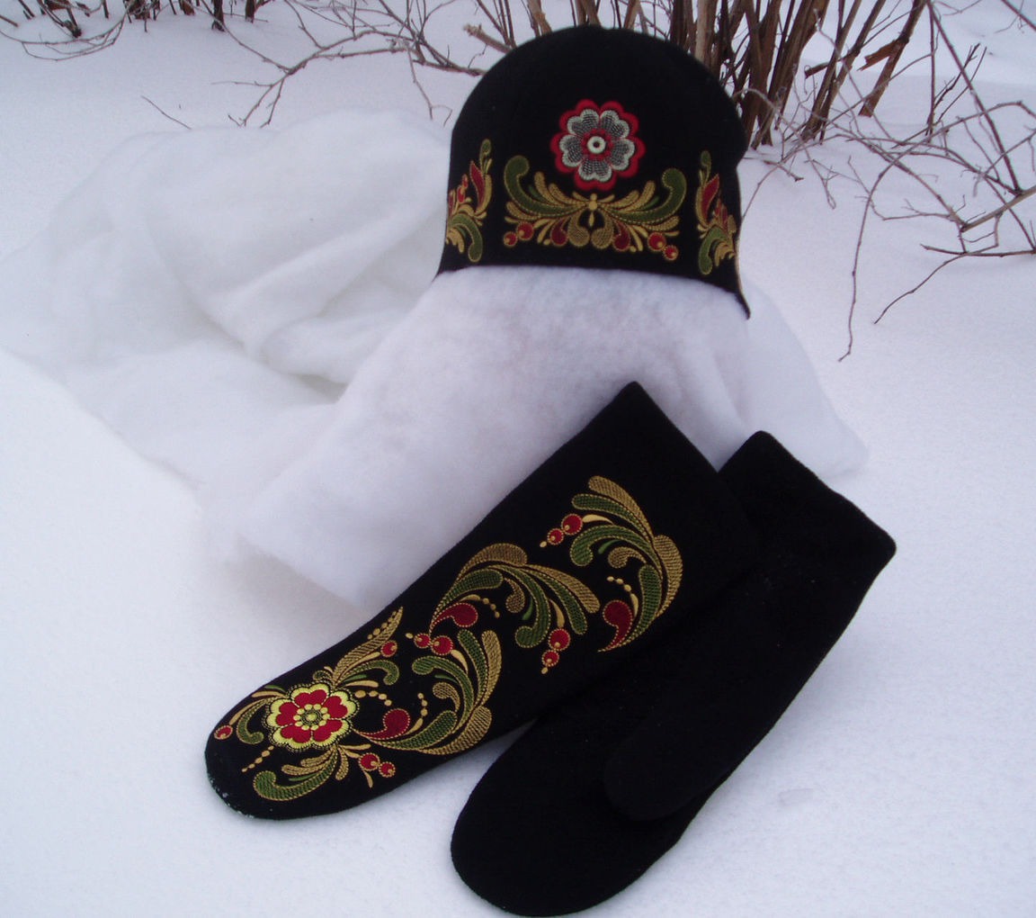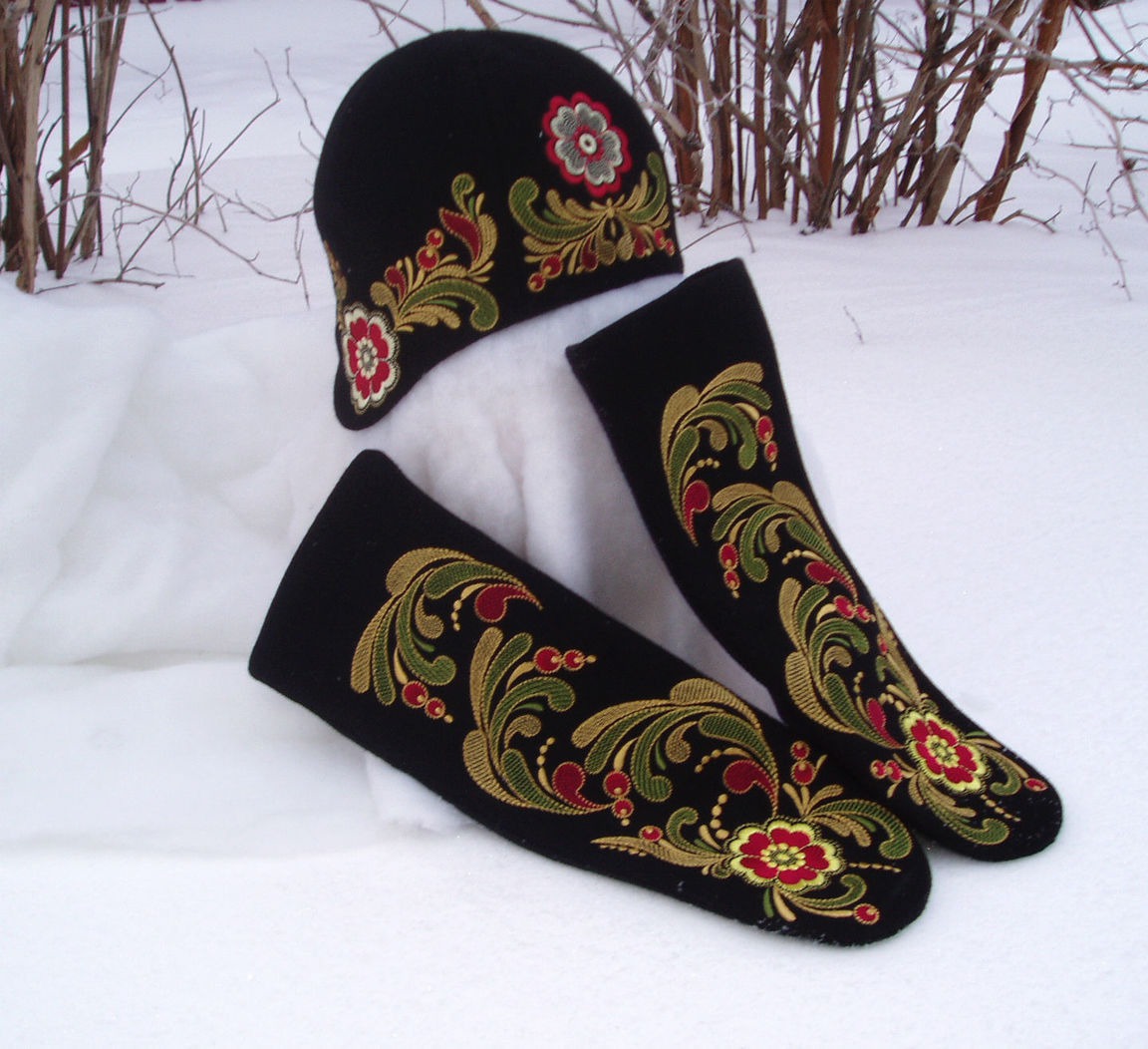 Шапочка с небольшими ушками из облегченнй пальтовой ткани на флисе и варежки с изумительной вышивкой в славянском стиле, вышитым на машине. Варежки 0чень теплые двойные.