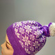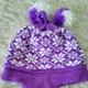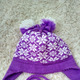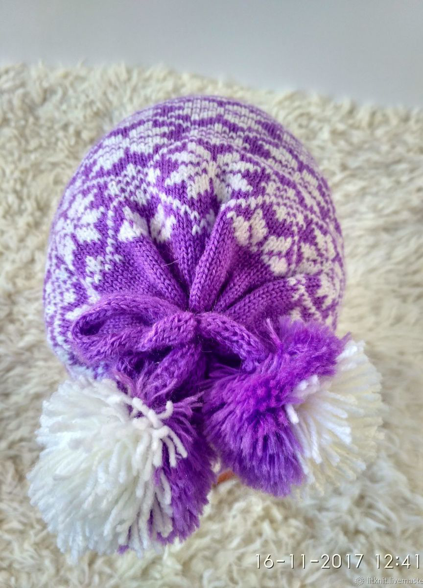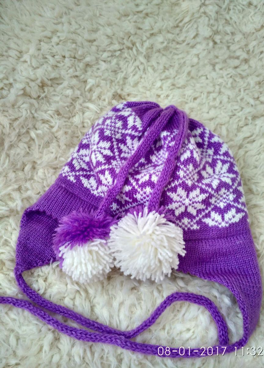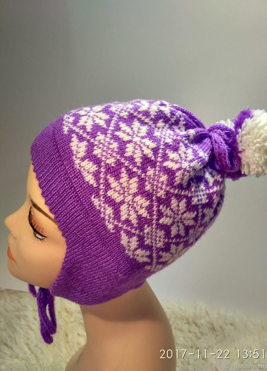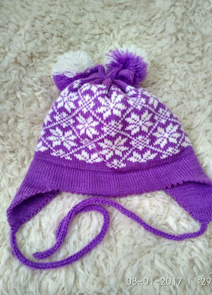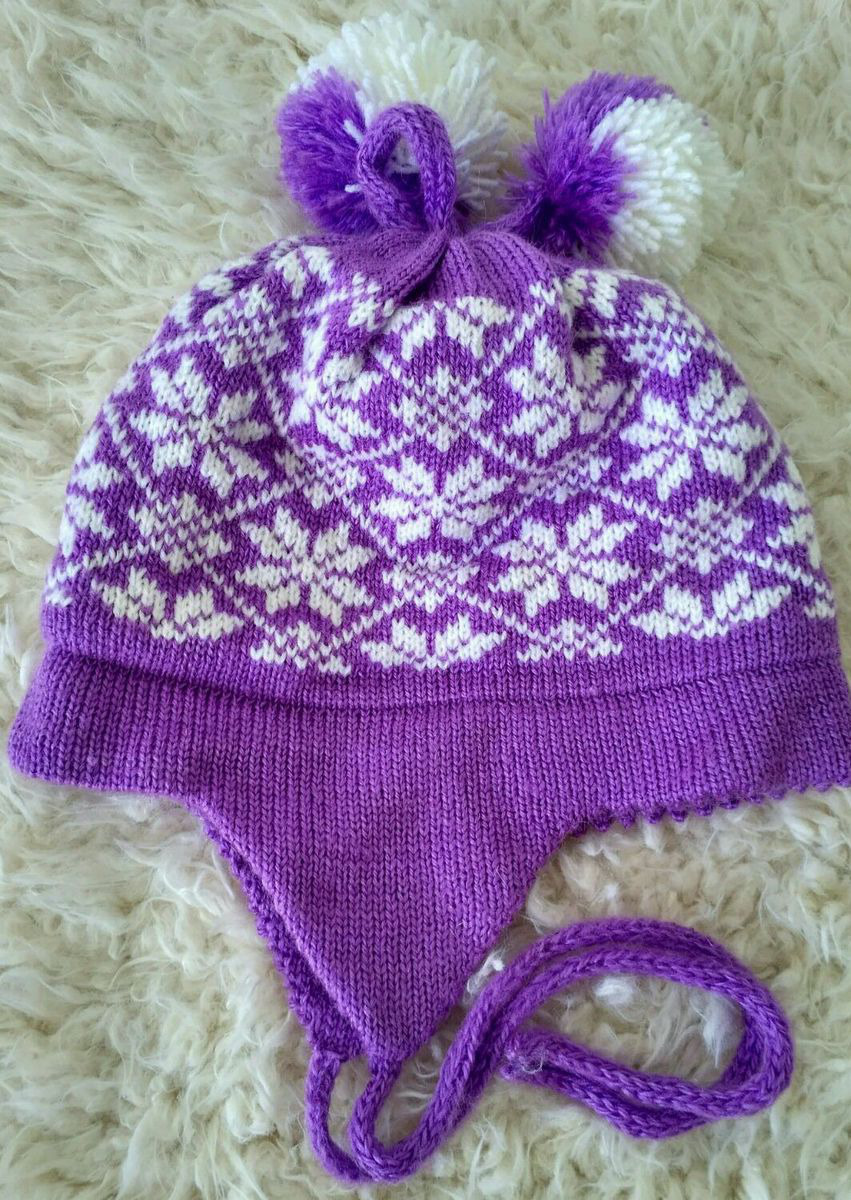 В холодные осенние и зимние дни без уютной, нарядной шапочки не обойтись. Порадуйте вашего малыша вязаной, теплой обновкой. Шапочка детская сиреневого цвета, с белым орнаментом в виде снежинок, связана жаккардовым узором из полушерстяной пряжи. Шапочка двойная ( на подкладке) с ушками на завязках, связанных из той же пряжи, что и шапочка круговым вязанием. Шапочка украшена двумя бубонами, выполненным из ниток того же цвета, что и сама шапочка, на шнурках.