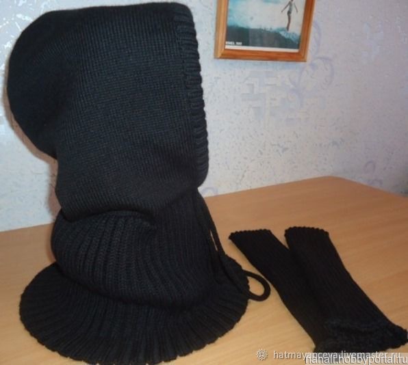 Чёрный снуд-капюшон, длина 51 см, ширина 25-29 см. Мягкий, лёгкий, свободный, не обтягивает, тёплый, горло всегда закрыто, по необходимости одевается капюшон. К нему - митенки чёрного цвета .Модный, стильный комплект.