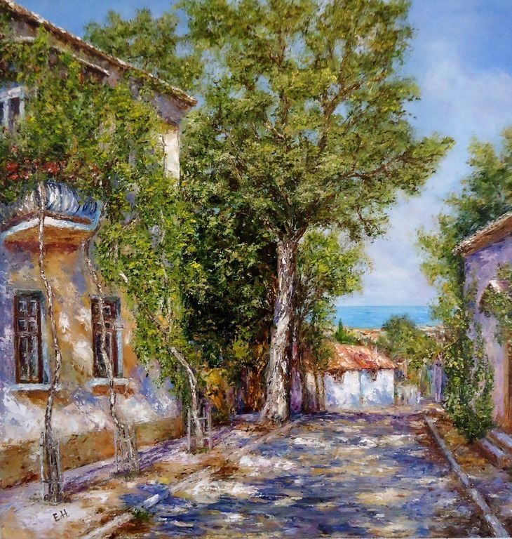 зелёный, море, дерево, солнце, бежевый, лето, подарок, сиреневый, картина для интерьера, холст, зелень, картина маслом, городской пейзаж, холст на подрамнике, масло, дома, курорт, южный пейзаж, тенистая улочка