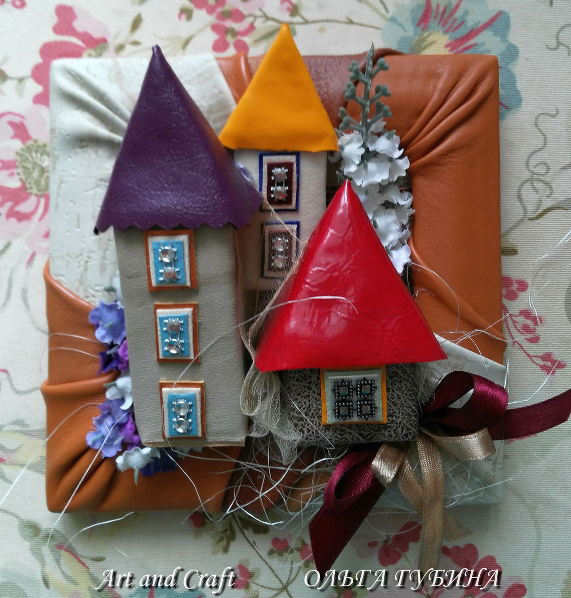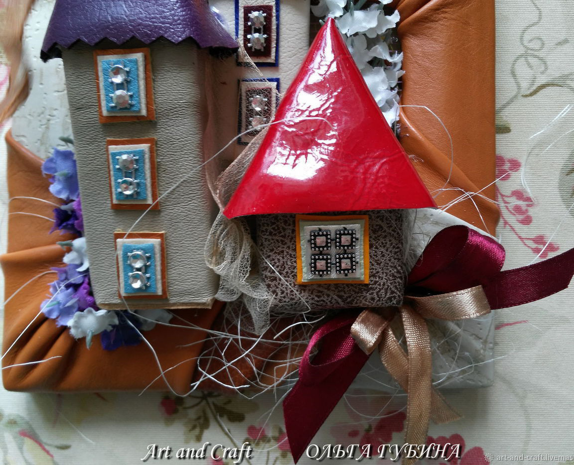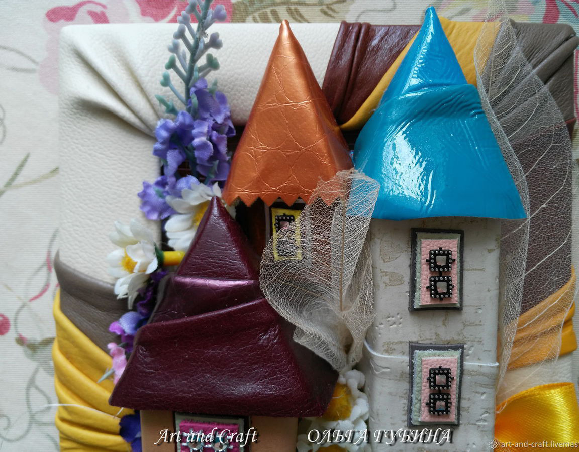 подарок, кожа натуральная, декор для интерьера, панно в подарок, панно для интерьера, Миниатюра, домики, душевный подарок, сказочный город