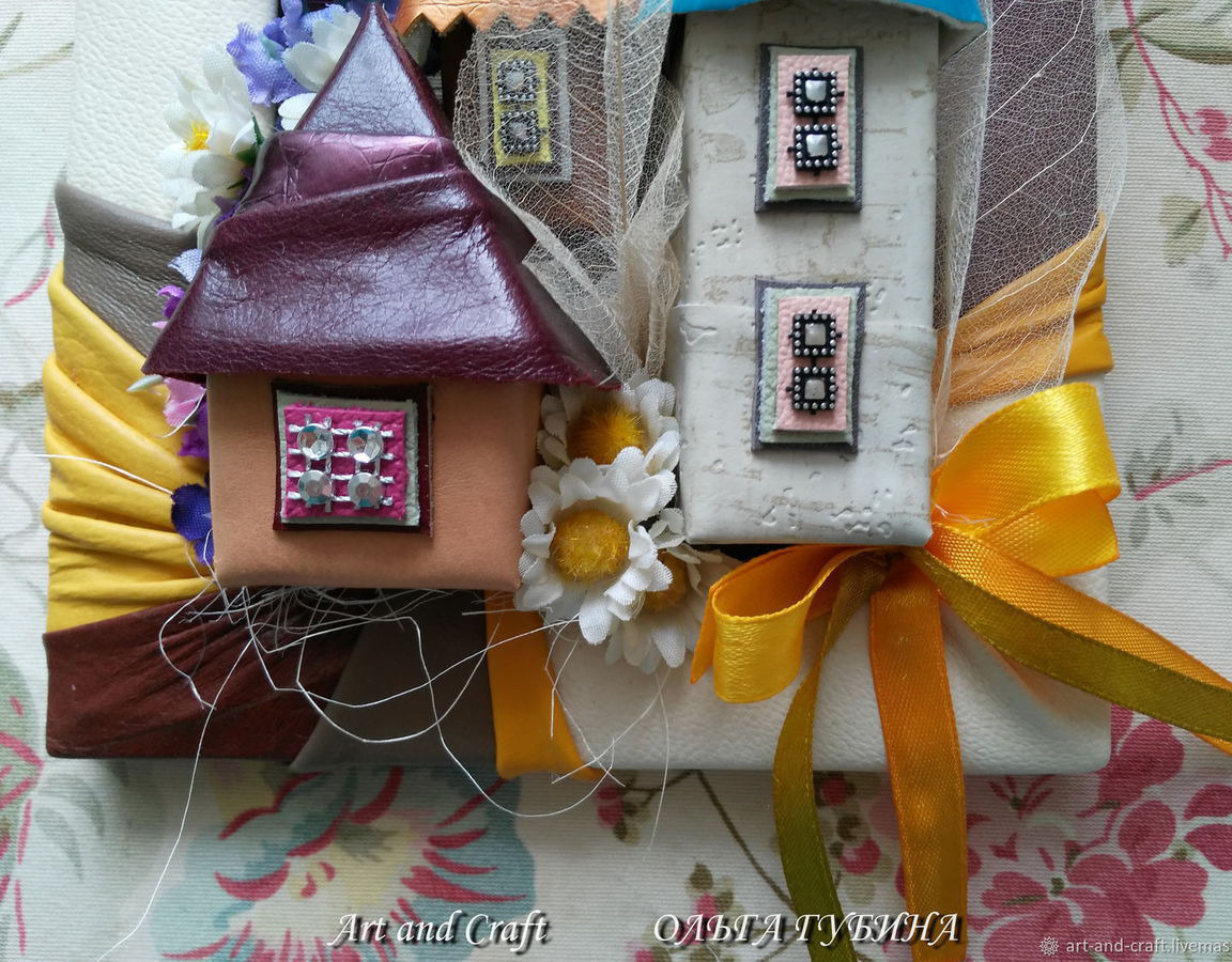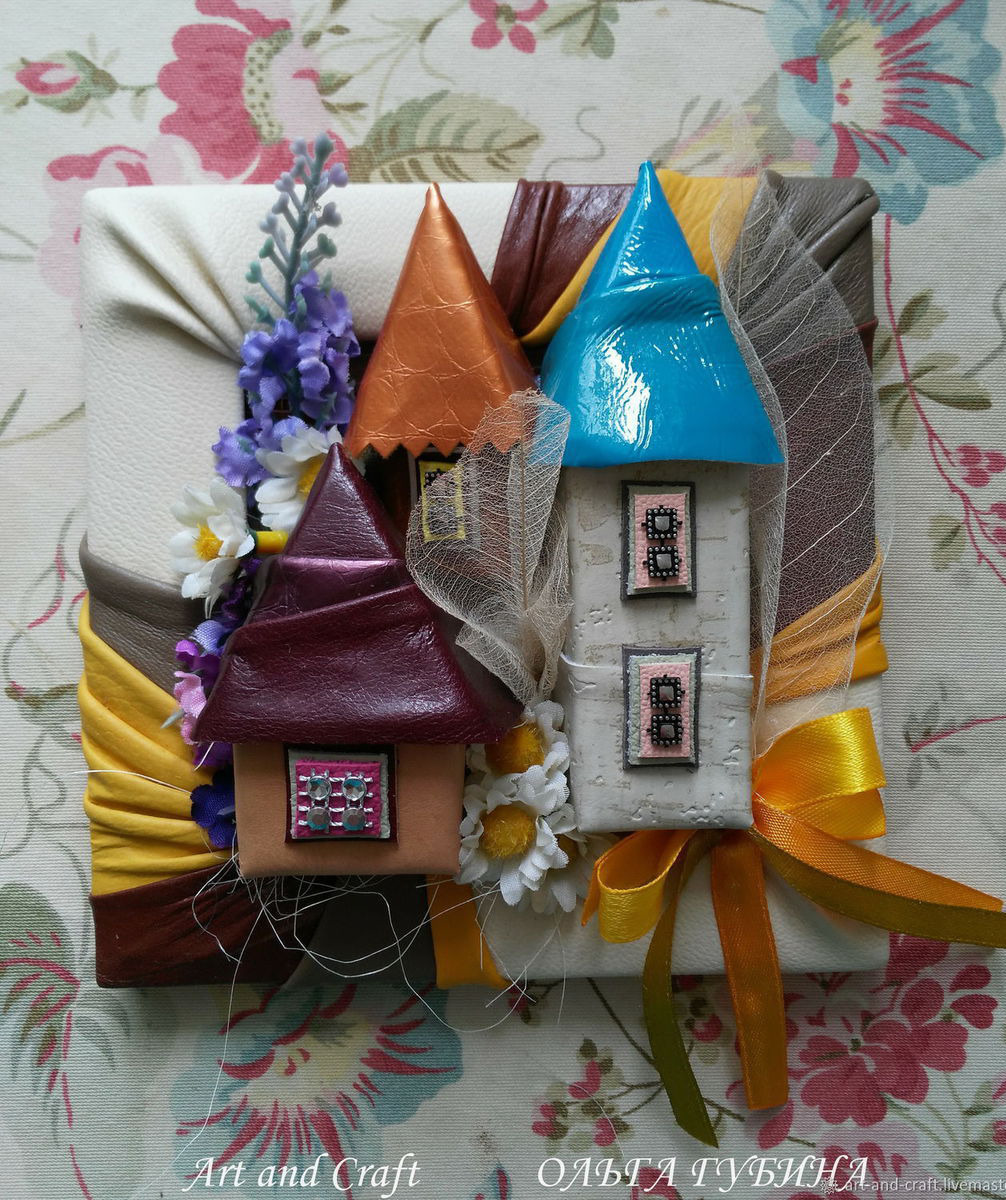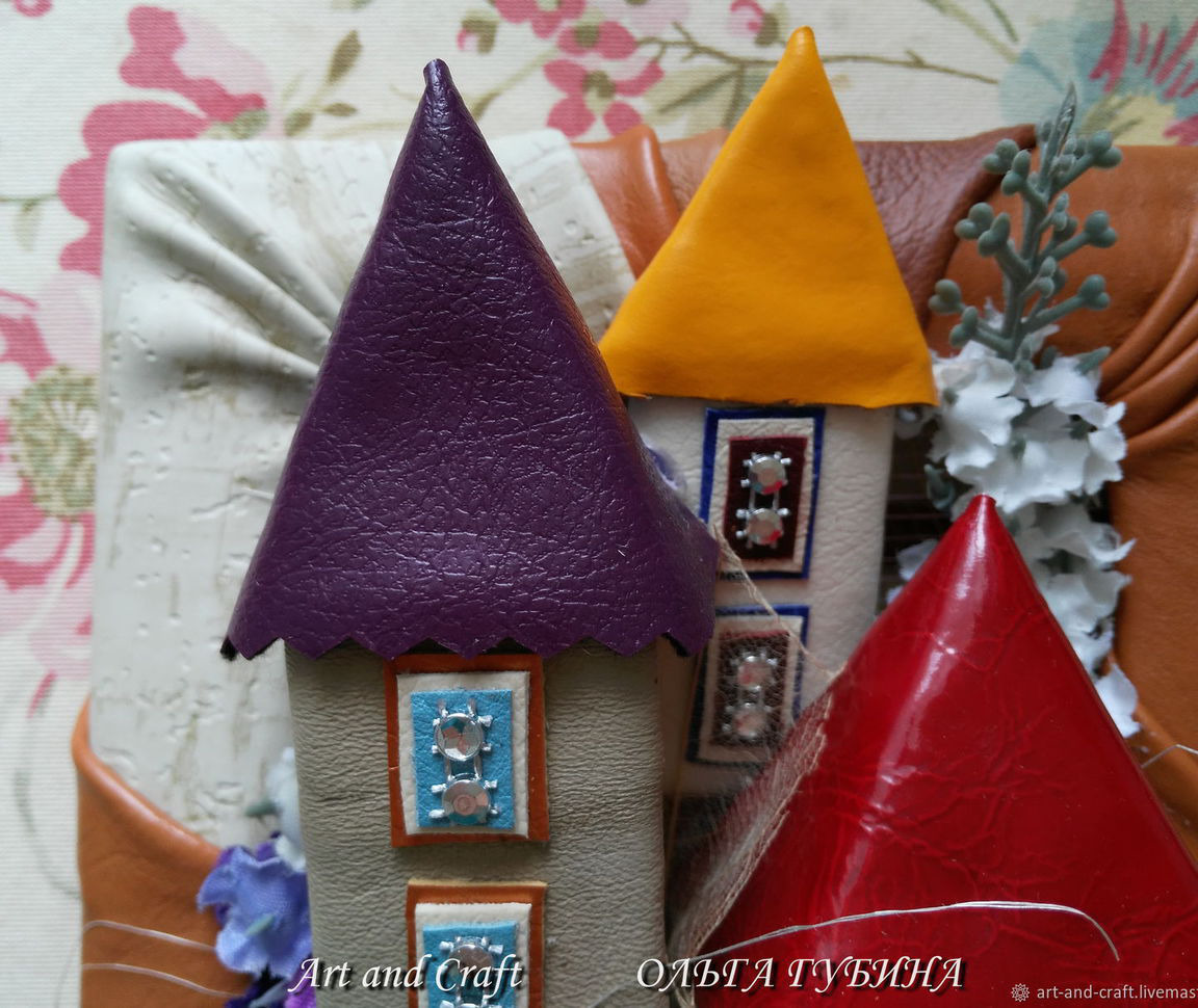 подарок, кожа натуральная, декор для интерьера, панно в подарок, панно для интерьера, Миниатюра, домики, душевный подарок, сказочный город