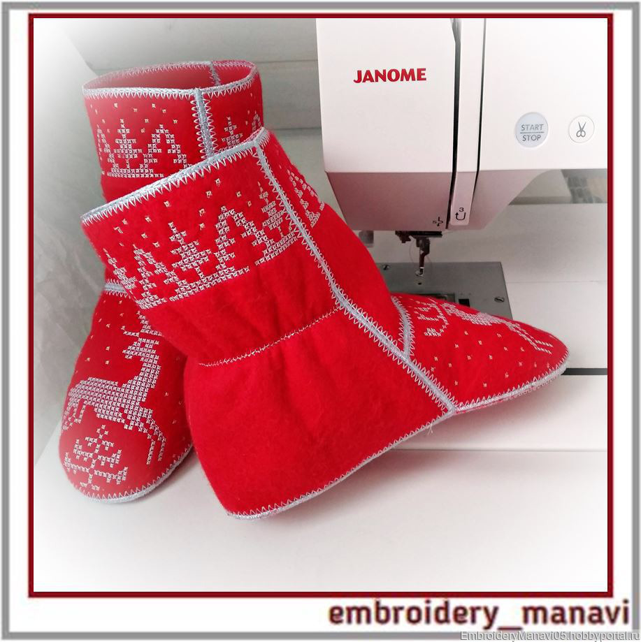 Дизайн для машинной вышивки. Домашние сапоги - все детали по отдельности готовые в пяльцах. 3 размера - на длину ступни 23, 25 и 27 см. Пошаговая видео инструкция. Я сшивала на руках, но можно на швейной машине в режиме зиг-заг. Для пялец 200 х 280 мм( но если делать подошву не в вышивальной машине, то можно сделать в пяльцах 200 х 200 мм.