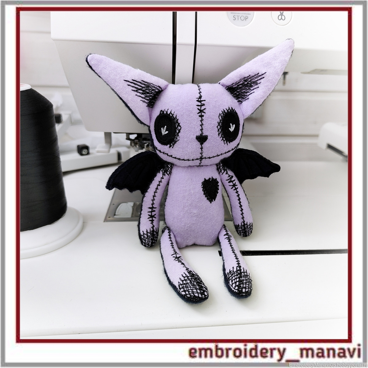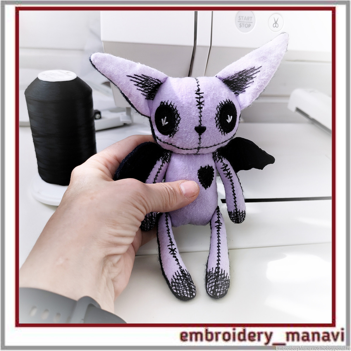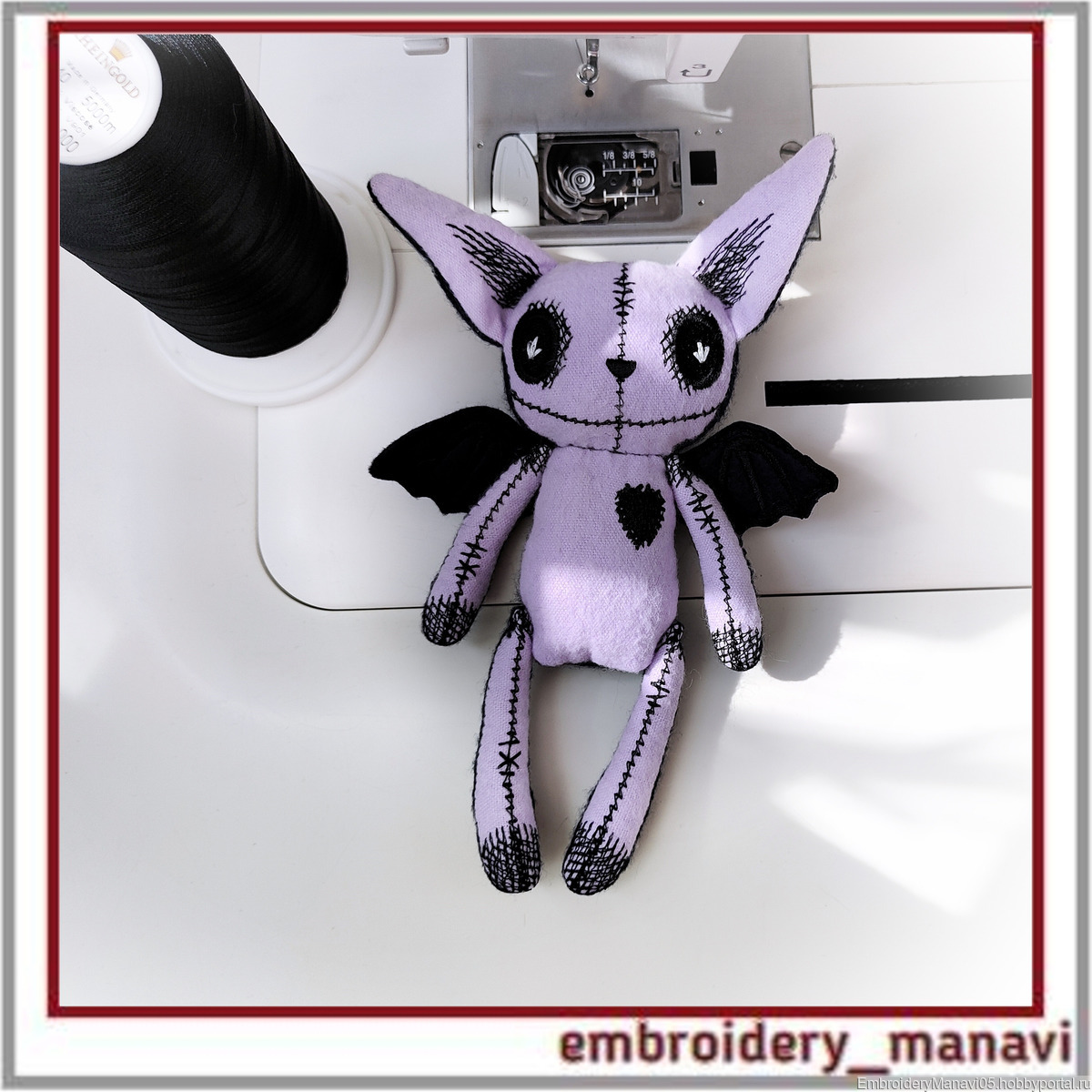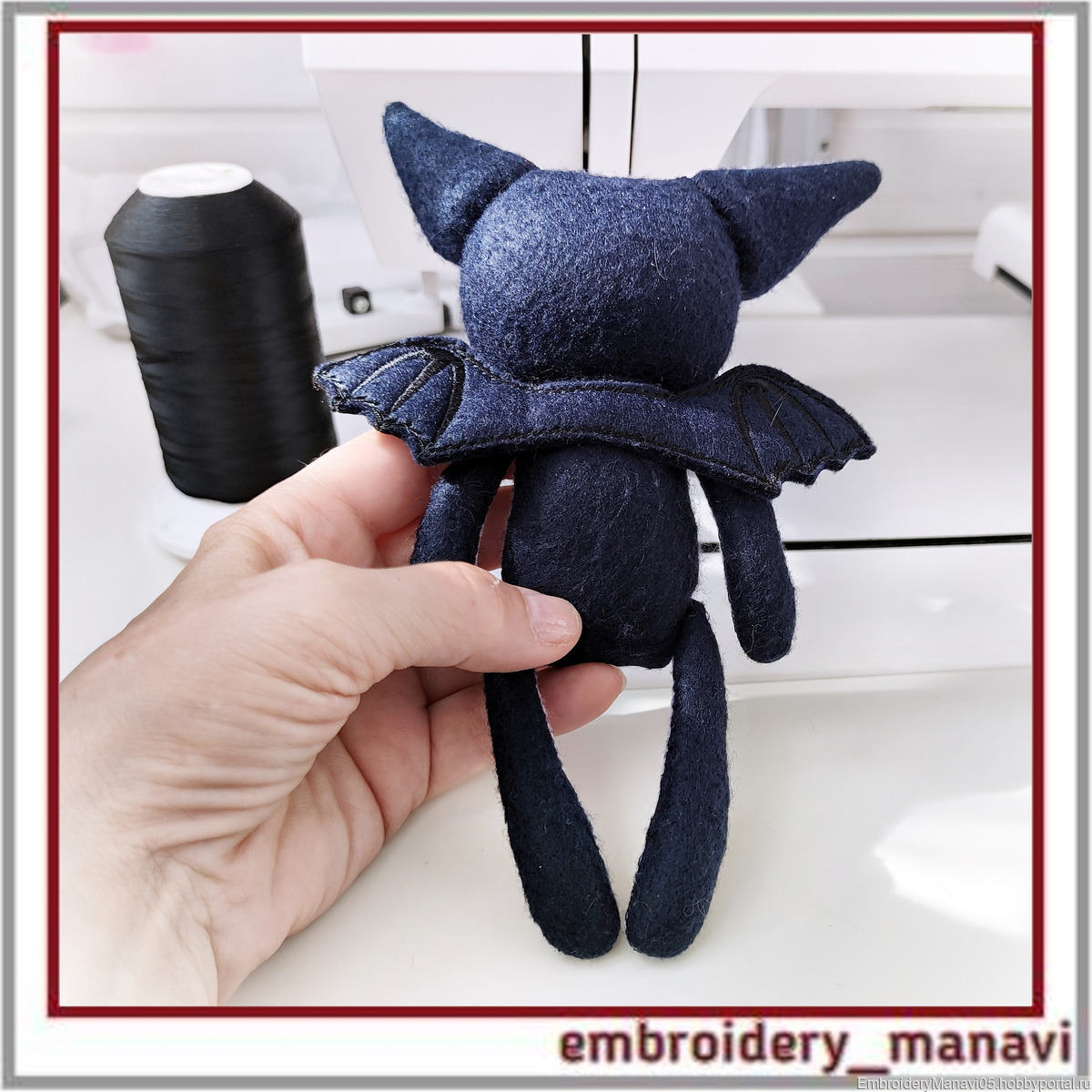 Дизайн для машинной вышивки. Кукла Летучая мышь Хэллоуин. Части заготавливаются в вышивальной машине. Для пялец 100 х 100 мм. Пошаговая инструкция и моё сопровождение по всем вопросам. Есть ручные работы - зашить отверстия после заполнения наполнителем, прикрепить лапы и крылья. В готовом виде игрушка 21 см. Всё вышивается одним цветом. Идея от Bucreshki.