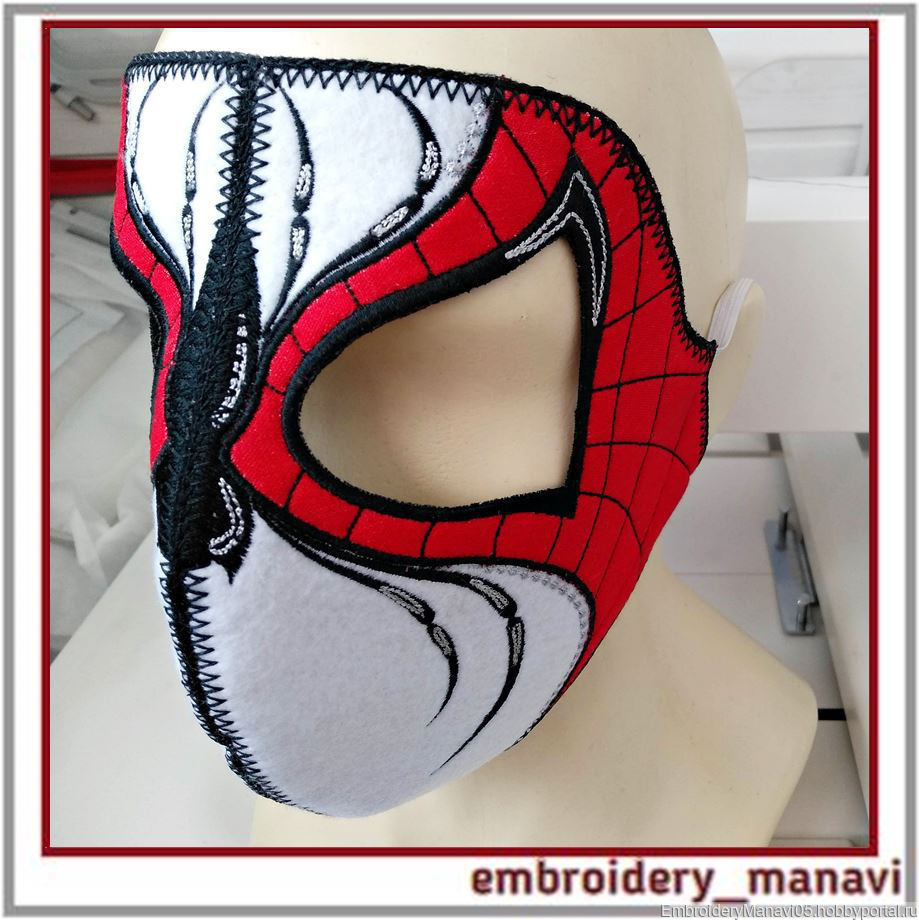 Дизайн для машинной вышивки. Маска паука из 4-х частей. 2 части стыкуются в пяльцах. Пошаговая видео инструкция. Размер дизайна 125 х 177 мм.
