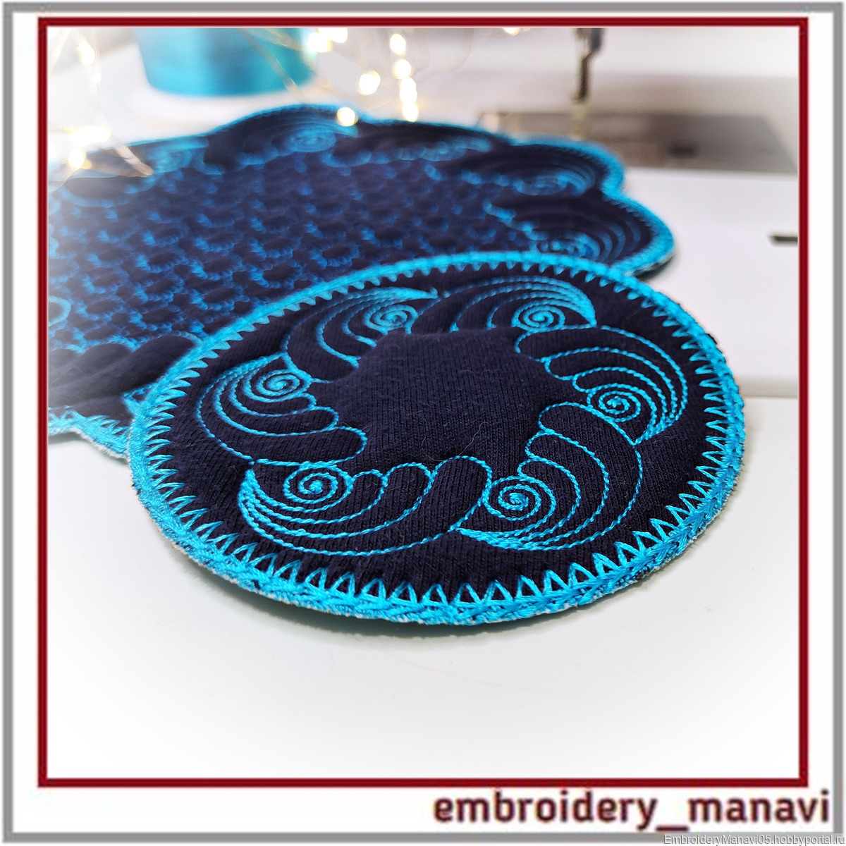 Дизайн для машинной вышивки. Набор из салфетки и подставок для чашек к чаю 1. Техника - стёжка, in the hoop. Текстовые пояснения по изготовлению салфетки и подставок в пяльцах. Салфетка и подставки сразу готовые в пяльцах. Размер салфетки 200 х 200 мм., подставки 100 х 100 мм.