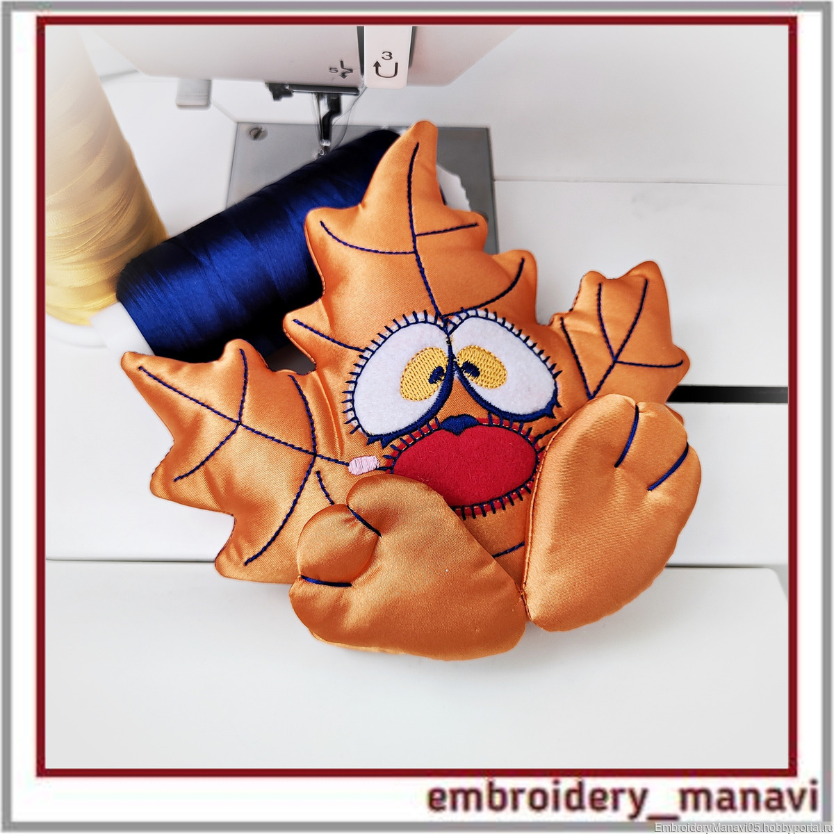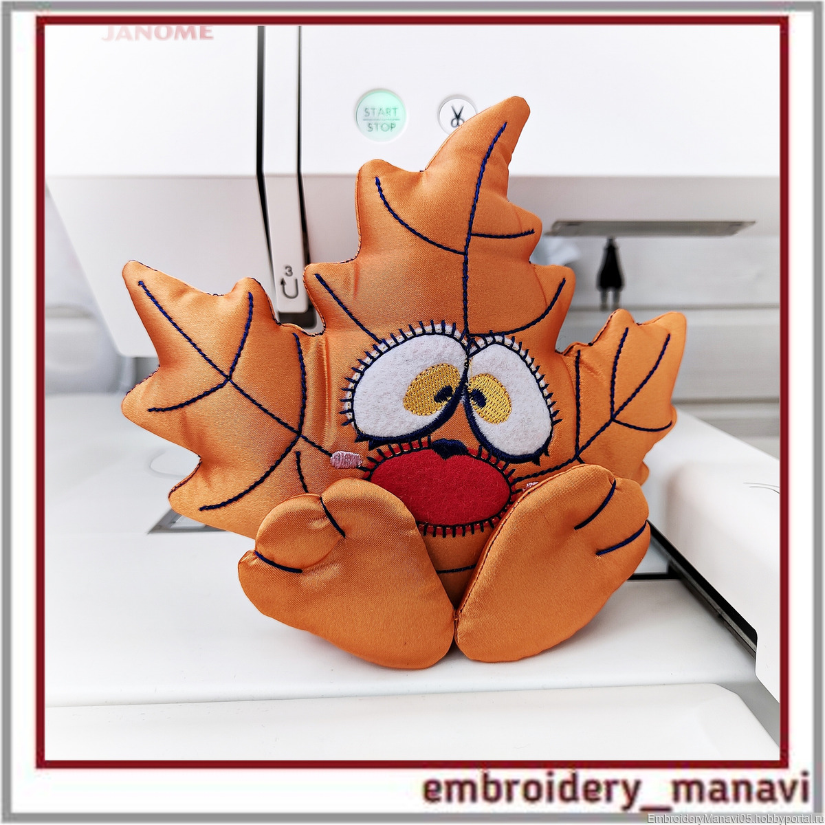 Дизайн для машинной вышивки. Осенний 3Д лист для домашнего уюта. 1 запяливание. Для пялец 200 х 200 мм. Пошаговая инструкция. Лист готов в пяльцах, остается вывернуть, заполнить детали наполнителем, зашить небольшое отверстие и закрепить лапки.