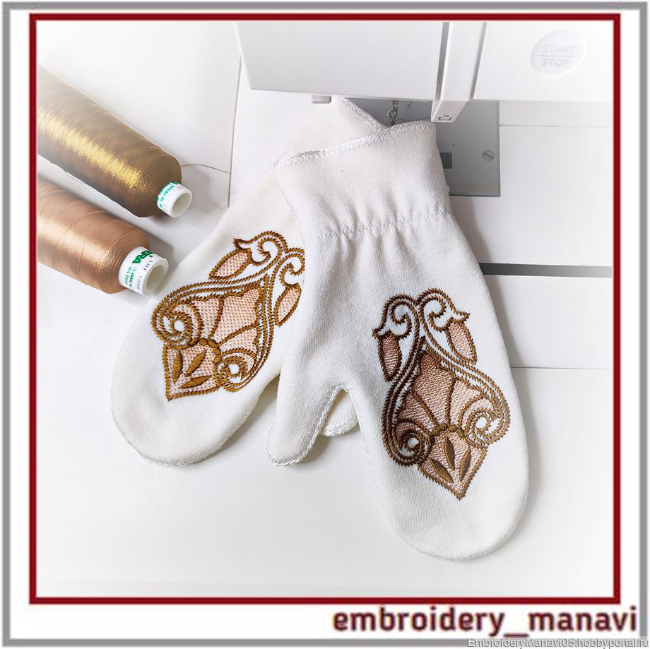 Дизайн для машинной вышивки. Варежки в пяльцах. Пошаговая инструкция. Соединение деталей вручную или на швейной машине в режиме зиг-заг. Для пялец не менее 180 х 260 мм.