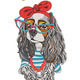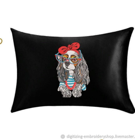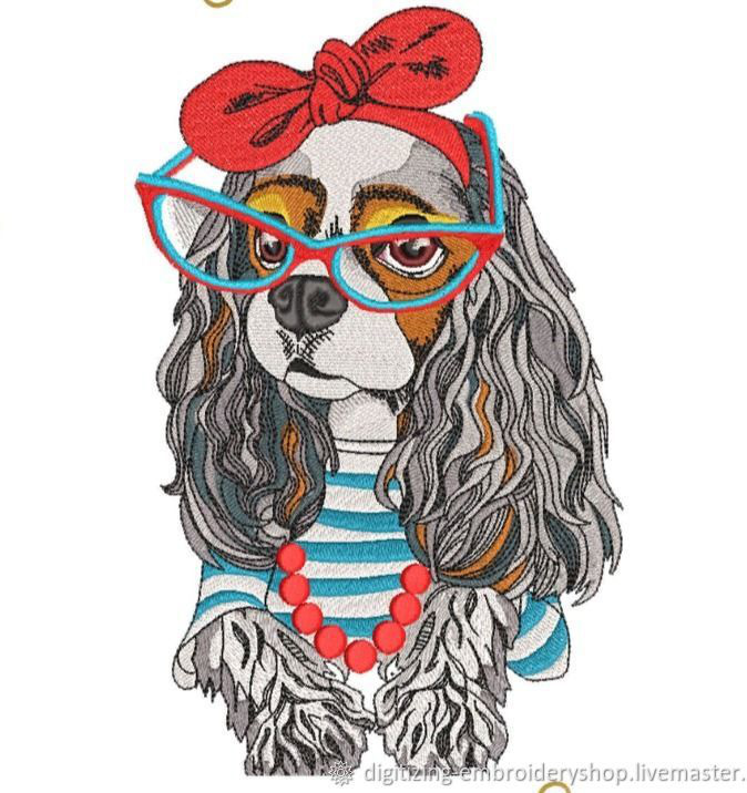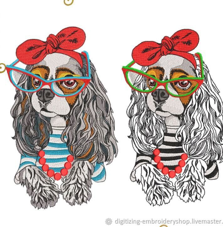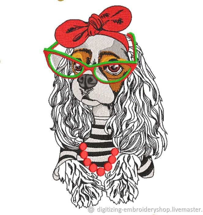 Дизайн машинной вышивки Собачка в матроске морячка с бантом и бусами, в очках, также более легкая версия, 2 варианта,