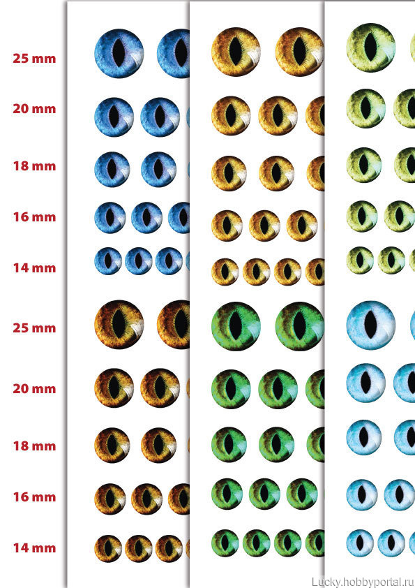 На трёх листах А4 представлены по два цвета глазок в отличном качестве (300 dpi, RGB). Диаметр глазок: 14 мм, 16 мм, 18 мм, 20 мм и 25 мм.