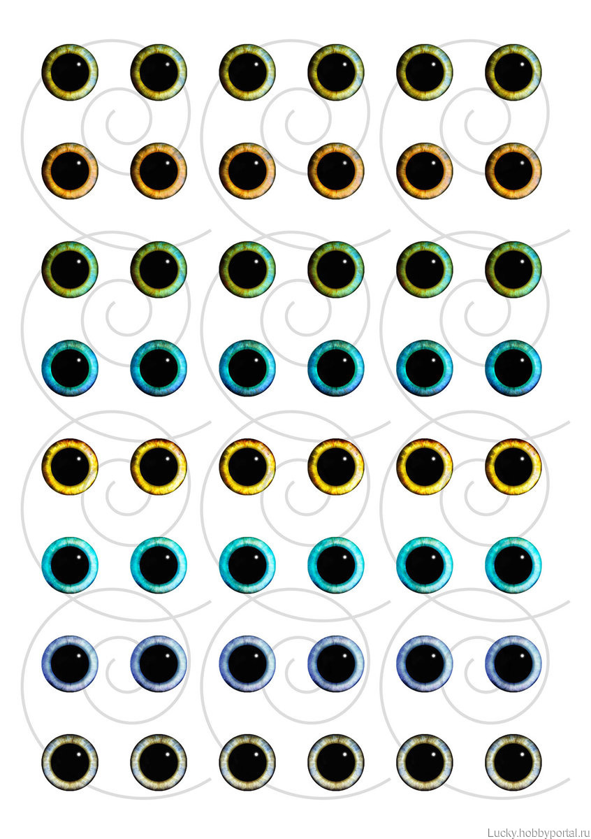 Диаметр глазок: 12, 14, 16 мм, 18 мм, 20 мм. Каждый размер на отдельной странице А4.