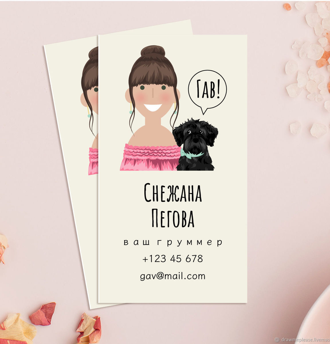 Визитки для мастеров с забавным портретом в мультяшном стиле. За дополнительную плату к вашему портрету можно добавить и портрет вашего питомца.
