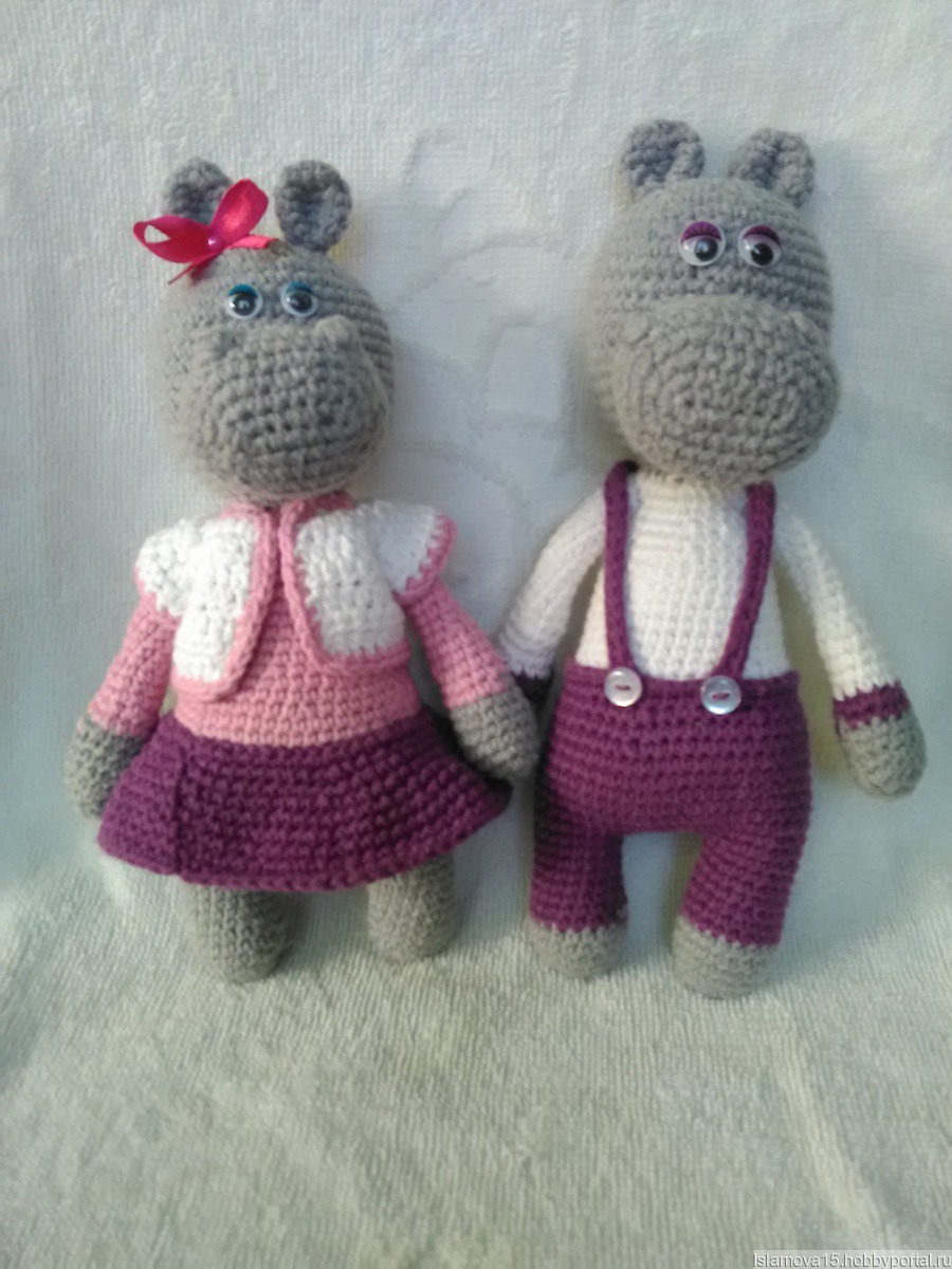 Семья бегемотов ищет маленьких хозяев, которые будут с ними играть каждый день))) Игрушки связанны из гипоаллергенной пряжи, высота Геры 22 см, Катя 21 см. У девочки снимается жилет.