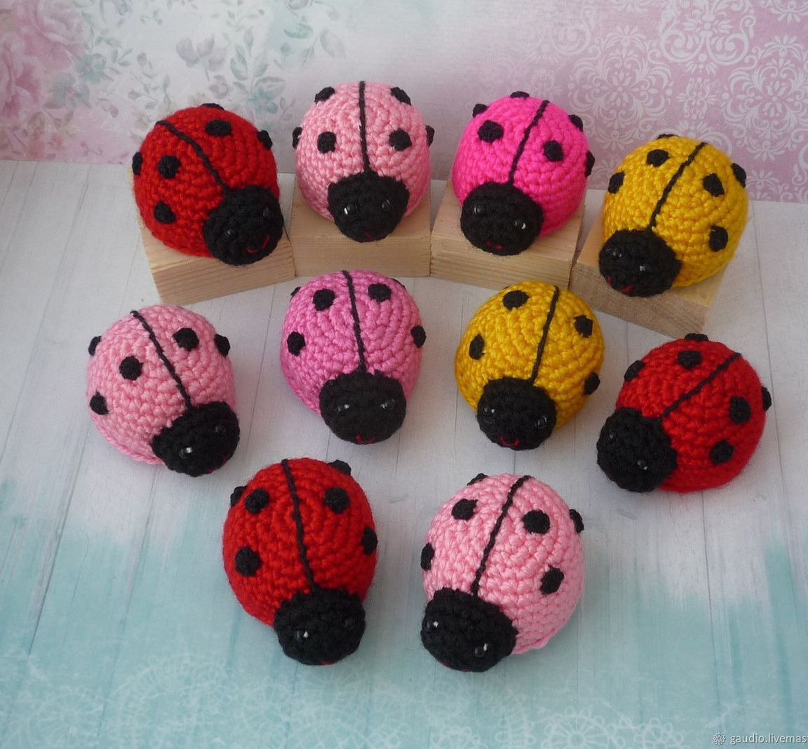 Для всех любителей божьих коровок - разноцветные маленькие сувениры ручной работы. Они связаны крючком из хлопковой и акриловой пряжи, глазки вышиты (или из бисера), наполнитель - холлофайбер.