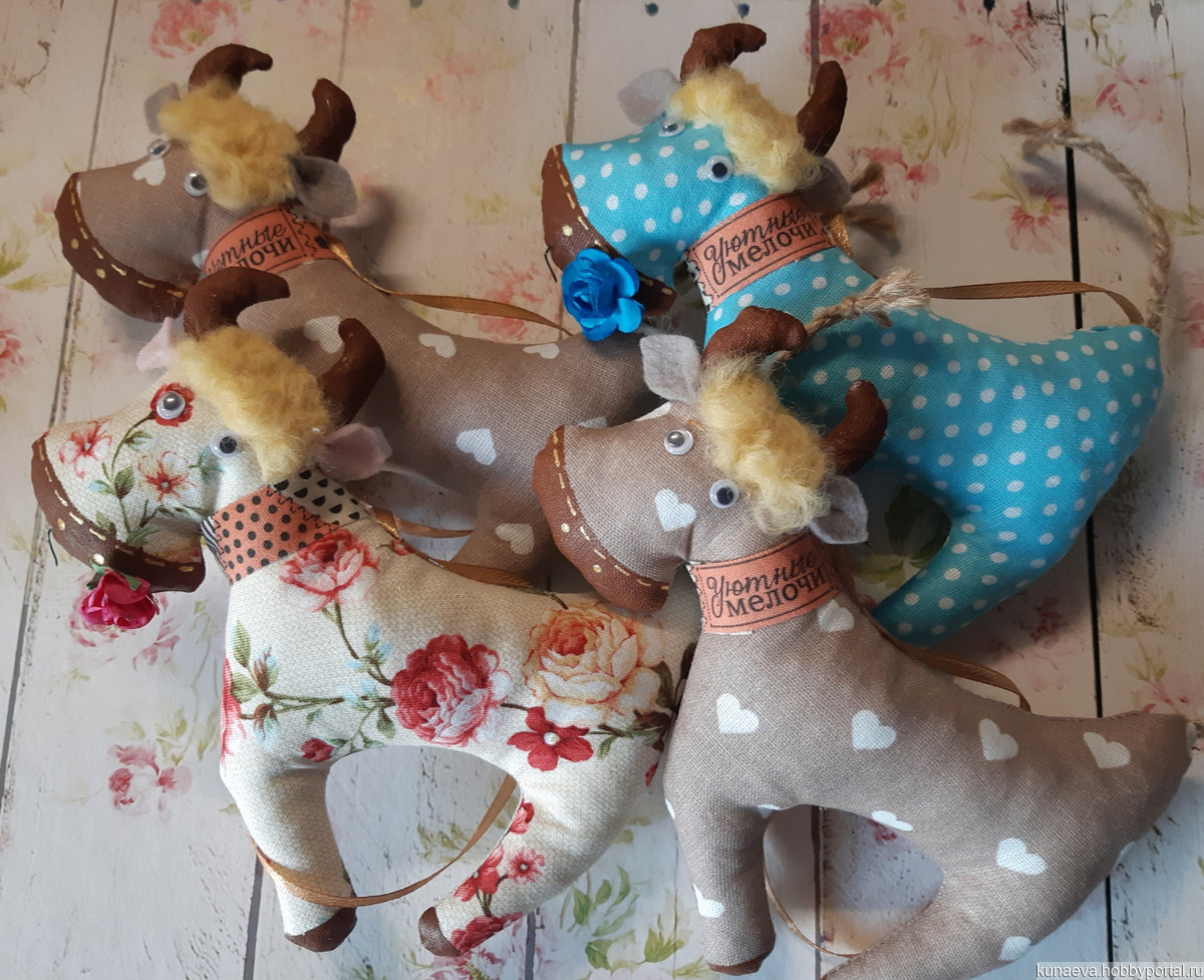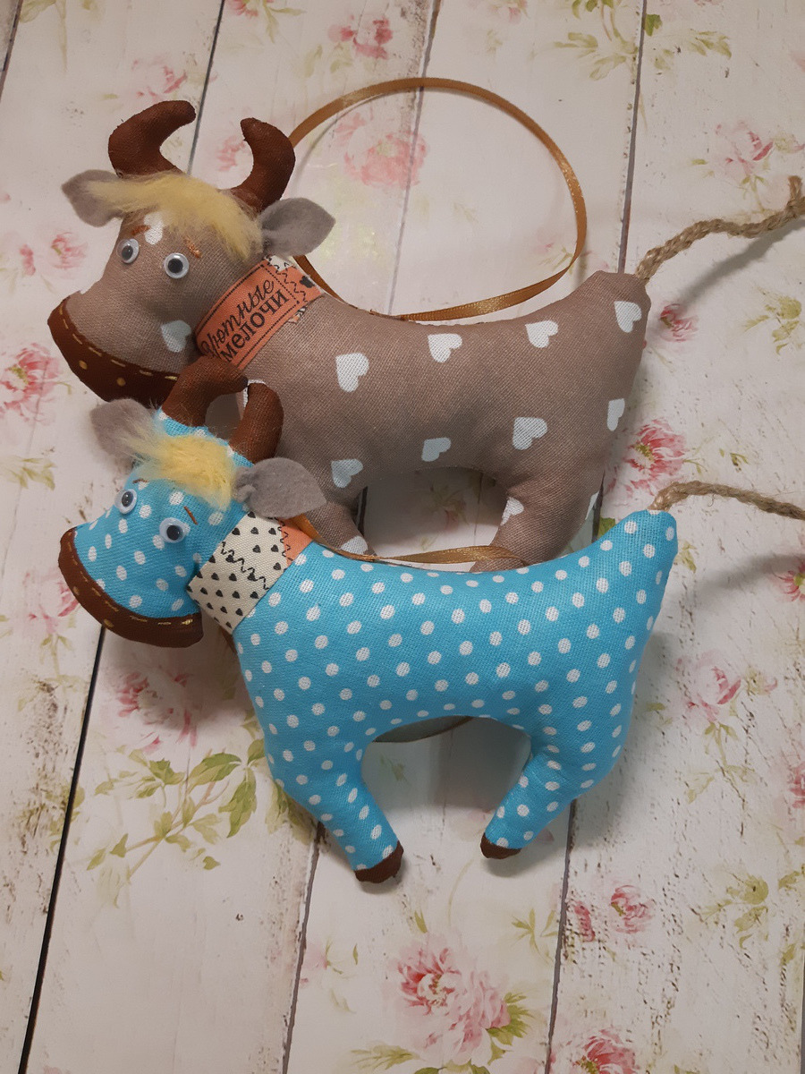 Каждый бычок рождается из хлопка, синтепона, ручной росписи акриловыми красочками по ткани и симпатичной фурнитуры. Будет очень стильной игрушкой на новогоднюю ёлку, подвеской в машину, приносящим удачу сувениром.