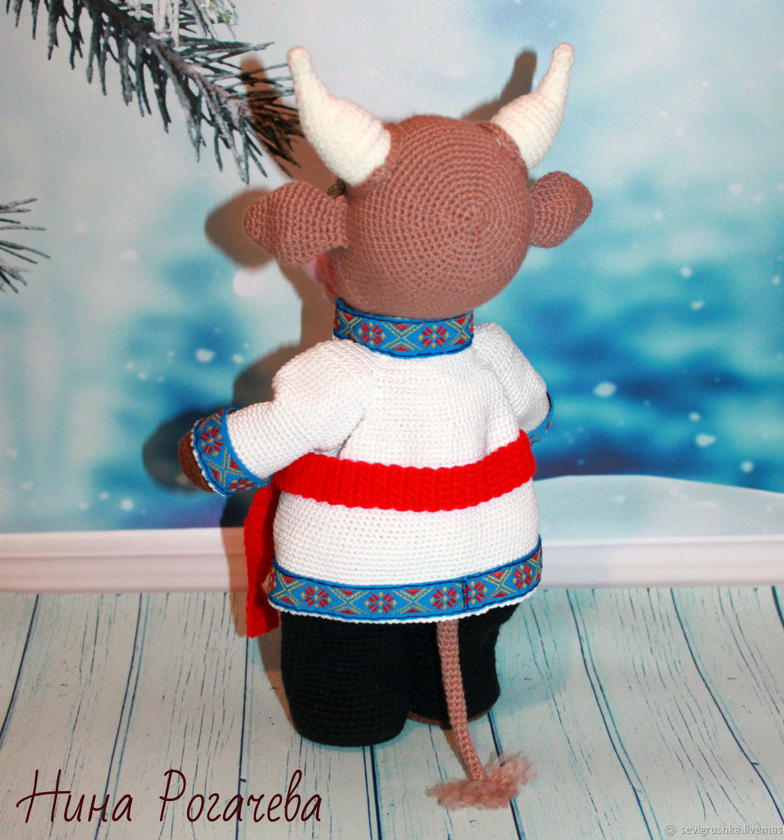 Ерофей связан из детской акриловой пряжи. Внутри игрушки находится металлический каркас, который придает ей больше подвижности, и вы можете менять положение копыт, сгибать их и разгибать. Также можно незначительно менять наклон головы. Высота игрушки 31 см с учетом рогов. Глаза стеклянные и прочно закреплены. Наполнитель - гипоаллергенный холлофайбер. Костюм у Ерофея связан из хлопковой пряжи, в русском народном стиле, не снимается.