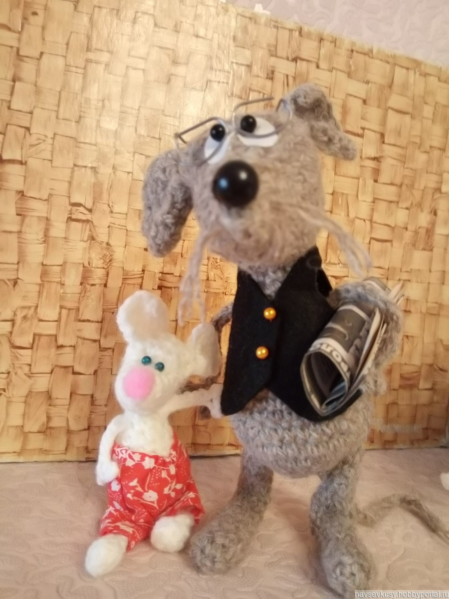 Мышки связаны крючком из пряжи акрил белого и серого цветов.Глазки -бусинки, проволочный каркас.Наполнитель вата.Штанишки из ситца, жилетка из фетра.Умильный новогодний подарок для детей и взрослых.Рост Деда 17 см.