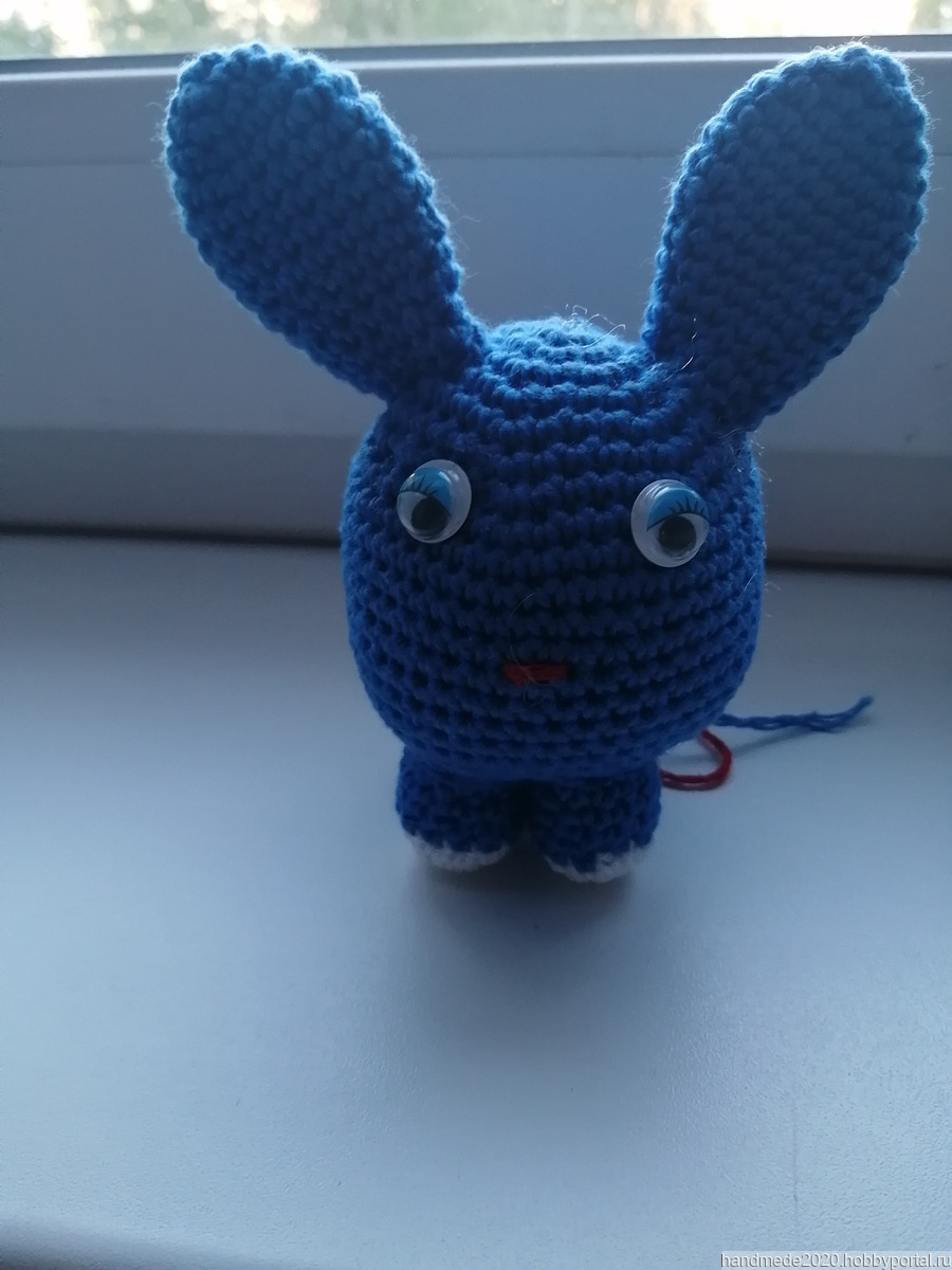 Игрушка связага крючком из хлопка синего цвета ушки и лапки пришиты глазки и хвостик приклеены
