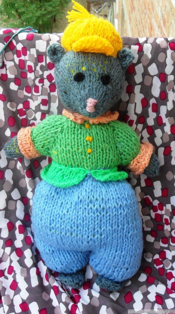 вязаная спицами игрушка ручной работы мышонок в желтой шапочке