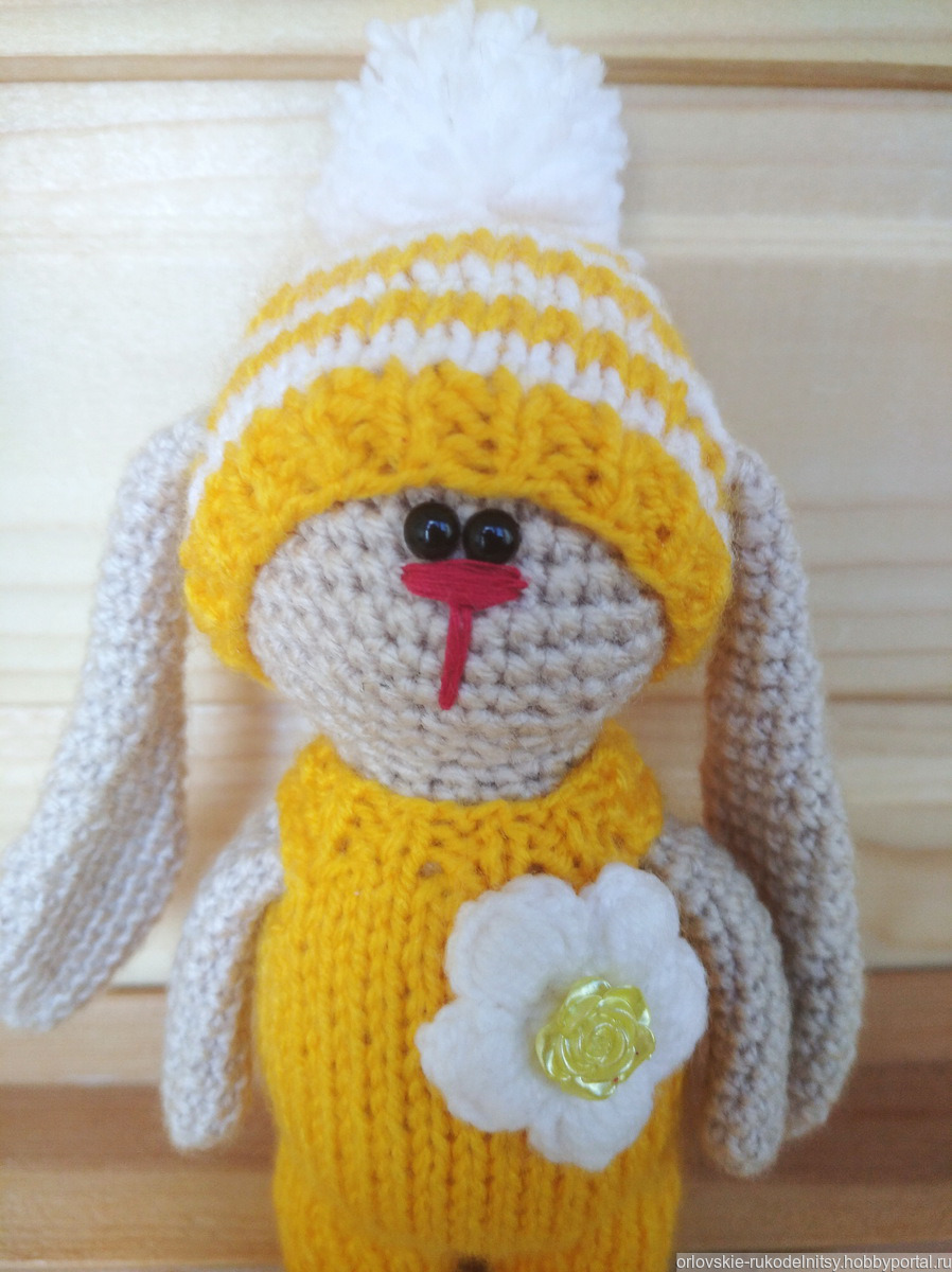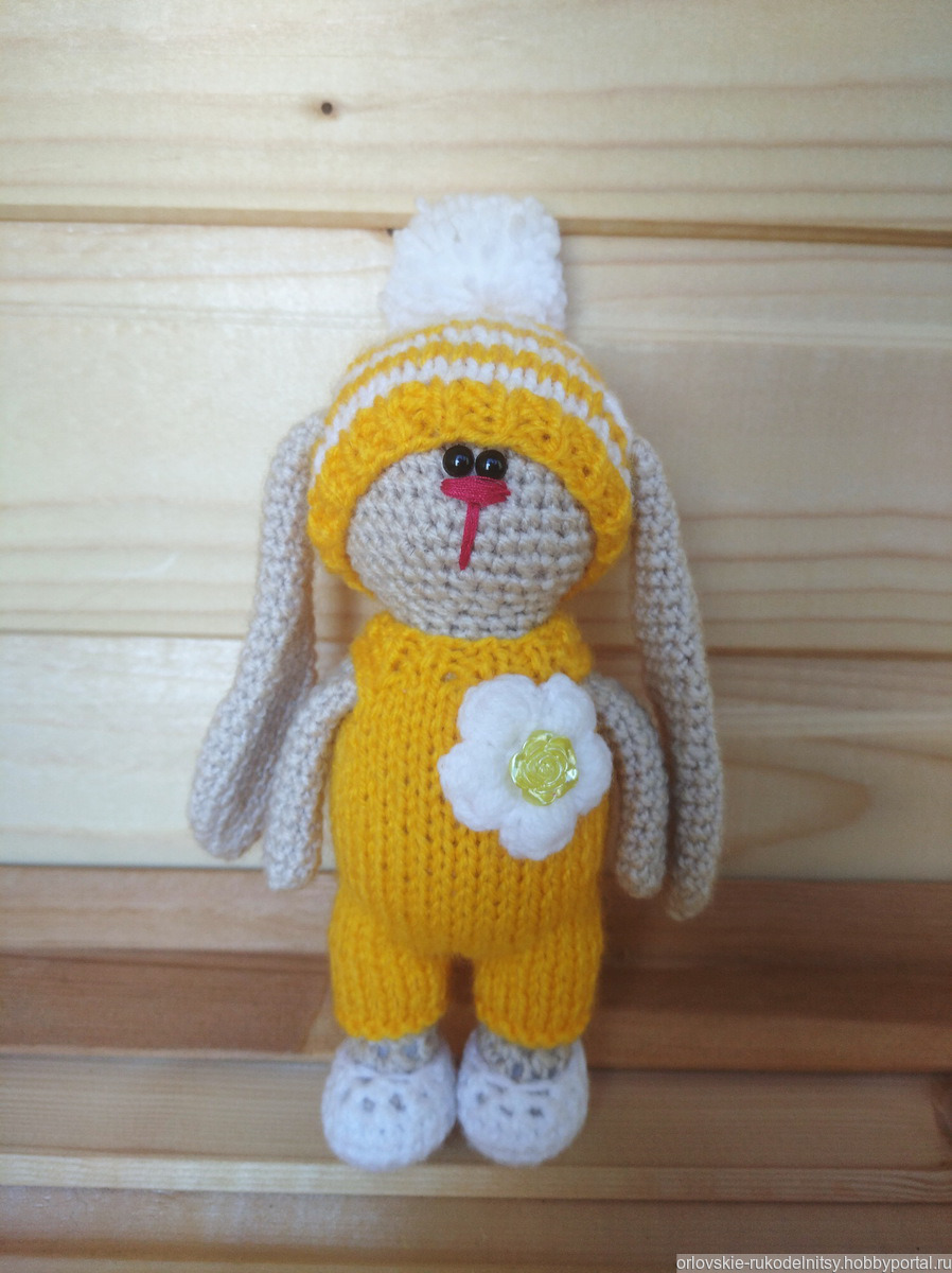 Игрушка вязаная мини-зайка. Комбинезон несъёмный. Шапочка снимается.