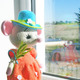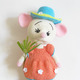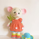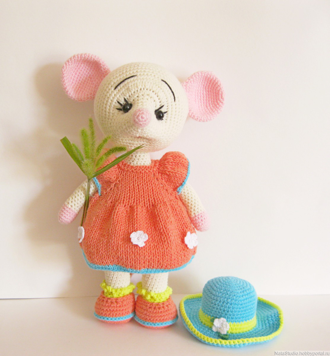 мышка связана из хлопковой пряжи. одета в платье, туфельки и шляпу. вся одежда снимается. рост мышки 30 cm. мышка может самостоятельно стоять. прилагается дополнительно платье.