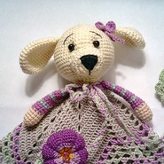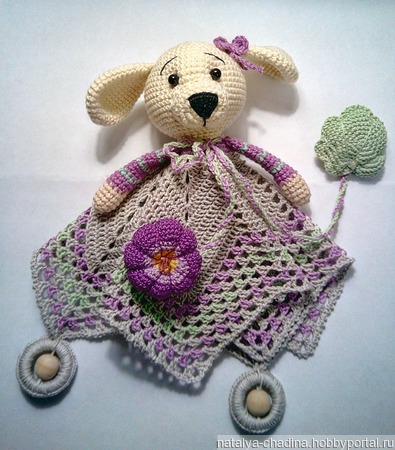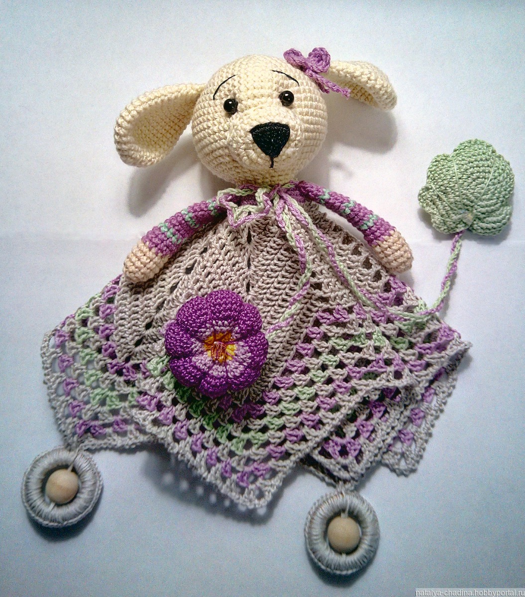 Комфортер для самых маленьких детей, можно использовать с рождения как небольшую мягкую игрушку. Связана из хлопковой пряжи без добавления синтетики. Очень красивая мордашка собачки ввязана в салфетку, не оторвётся никогда!