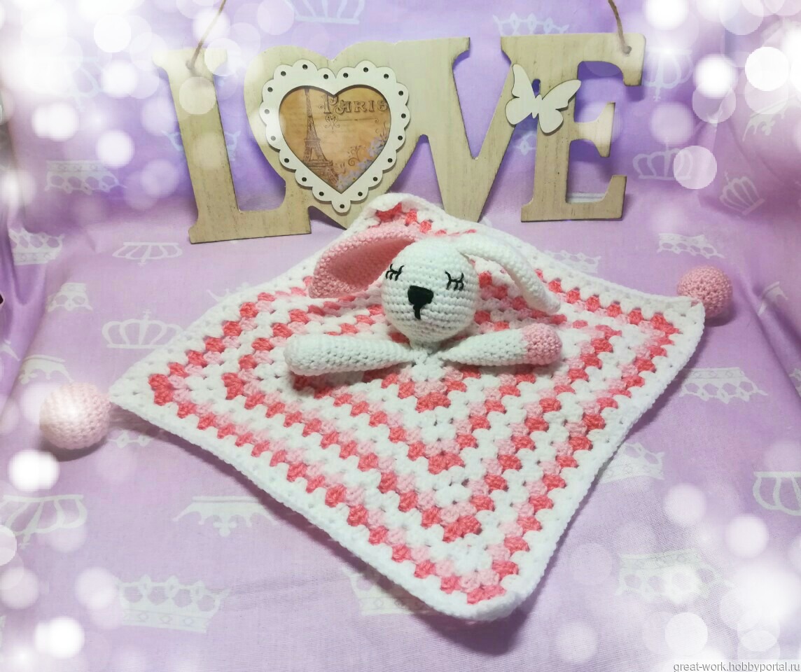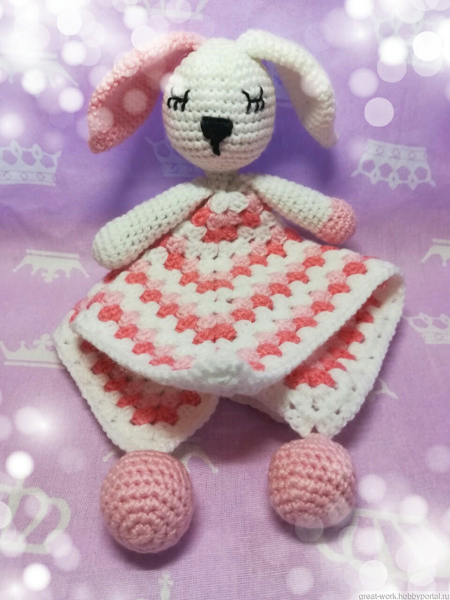 Вязаная игрушка комфортер Зайка - сплюшка. Комфортер это не просто игрушка. Во время кормления ребенка мама держит комфортер возле себя, и игрушка впитывает запах мамы. А когда мама укладывает малыша в кроватку, кладет рядом с ним и игрушку. Считается, что младенцы обладают очень тонким обонянием и, ощущая рядом родной мамин запах, чувствуют себя в безопасности. Таким образом, у ребенка формируется ассоциация данной игрушки с чувством безопасности и комфорта. Малыши любят эти игрушки и долго не расстаются с ними, играют с ними и везде берут с собой. Именно поэтому комфортеры еще называют игрушками-компаньонами. Комфортер Зайка выполнен из детской пряжи (гипоаллергенный акрил) не содержит пришивных элементов.