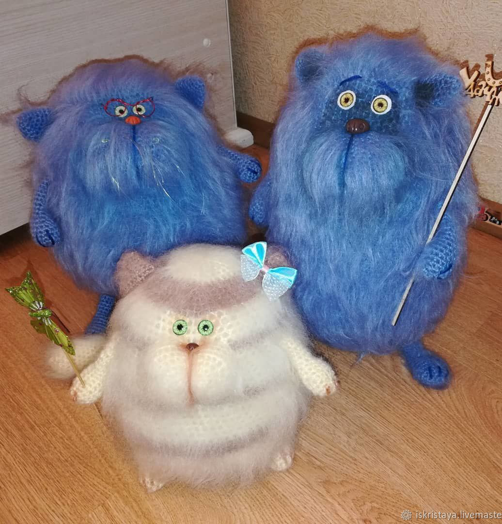 Представляю компанию котиков разных размеров.Самый большой высотой 40 см, средний 30 см и самый маленький 25 см.Выполнены из гипоалергенной пряжи, наполнитель холофайбер. Большой кот стоит 1200, средний 1000, маленький 800 рублей