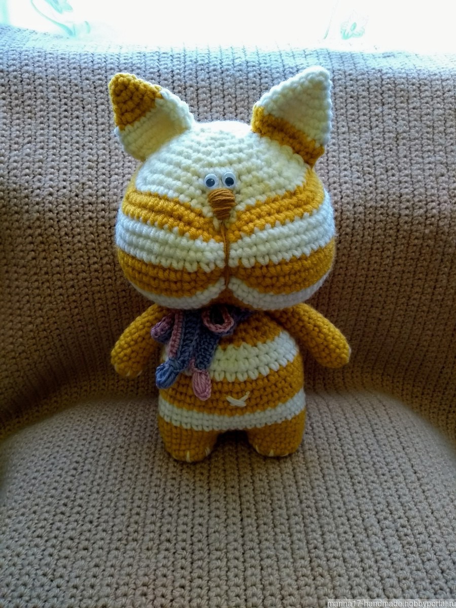 выполнен из объемной полушерстяной пряжи Турецкой фирмы Ализе,в желто-белом/молочно-белом/ исполнении,наполнитель синтепух, на шее повязан шарфик Размеры длина-35см,ширина 30см