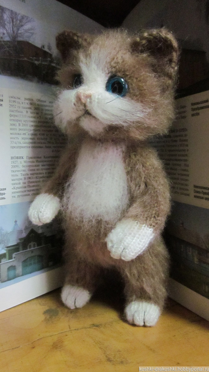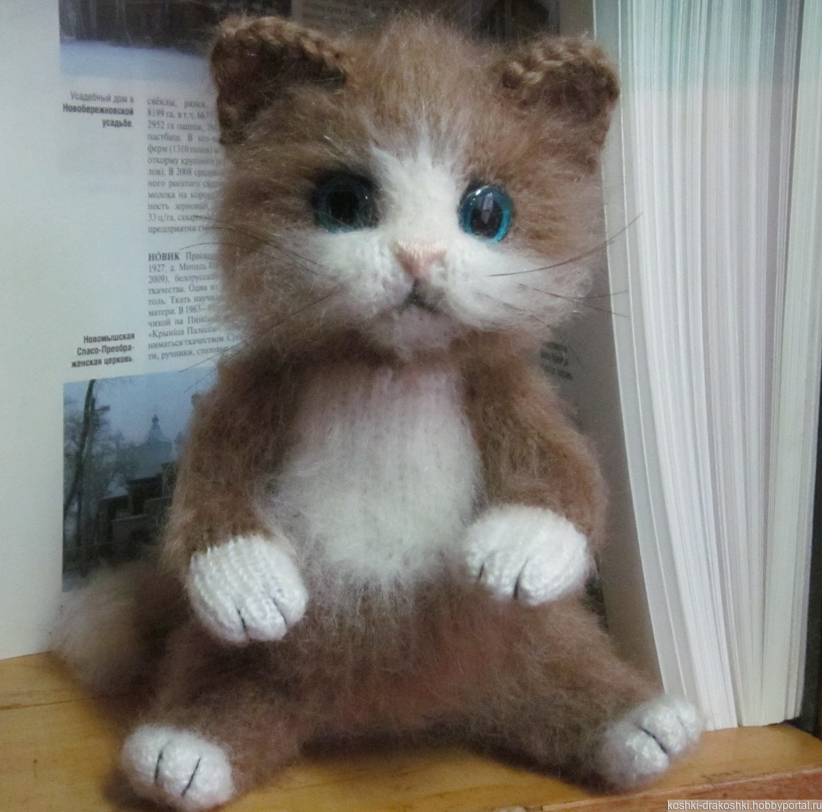 Пушистый вязаный рыжик ищет дом. Полностью на усиленном проволочном каркасе - может принимать любую позу. Тонирован акриловыми красками для ткани. Глаза - стекло, расписаны вручную. При вязании на заказ возможны варианты в цвете котика и глазок.