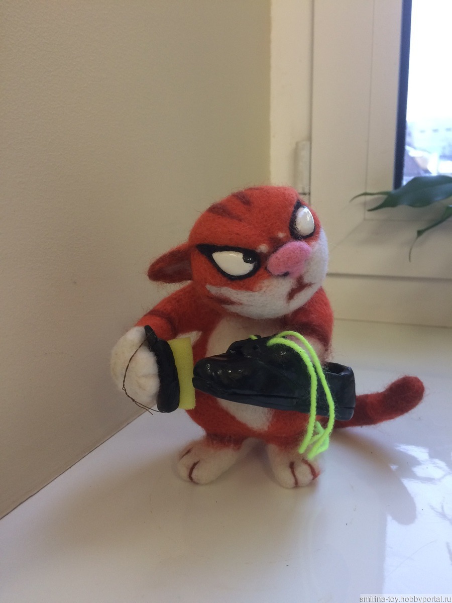 Котик. По мотивам картин Рины Зейнюк. Выполнен из 100% шерсти, методом сухого валяния. В котике проволочный каркас. Глазки из самоотвердевающей глины с ручным окрашиванием акрилом и покрытием специальным лаком, придающим блеск стекла. Аксессуары из запекаемой полимерной глины: ботинок и щетка. Сувенирная, интерьерная игрушка.