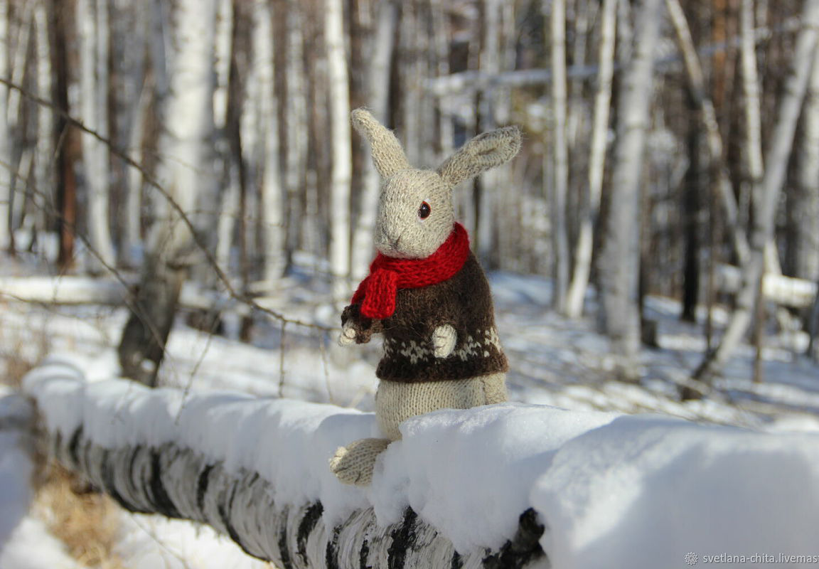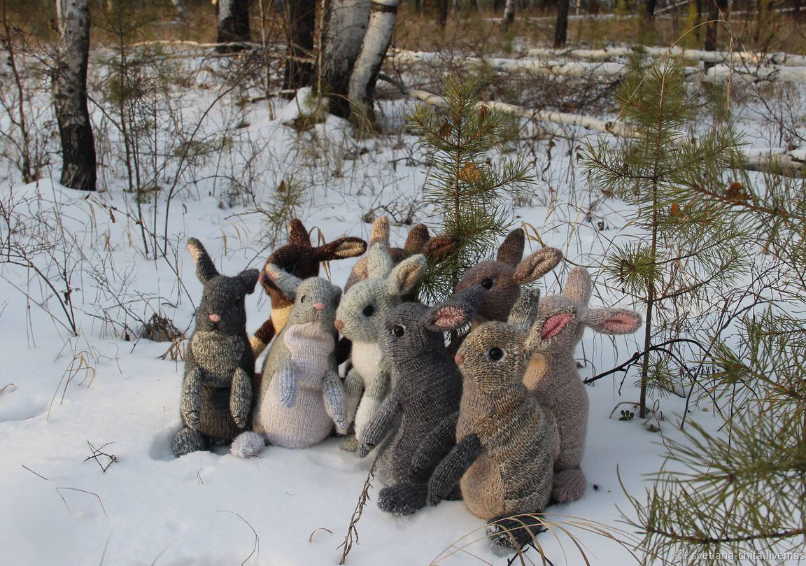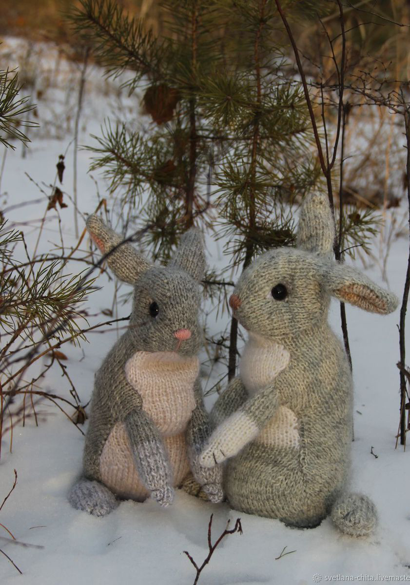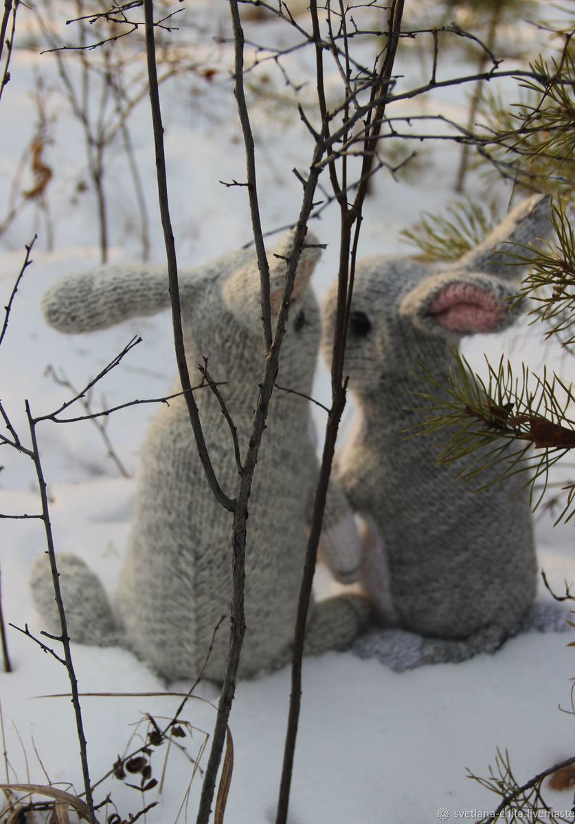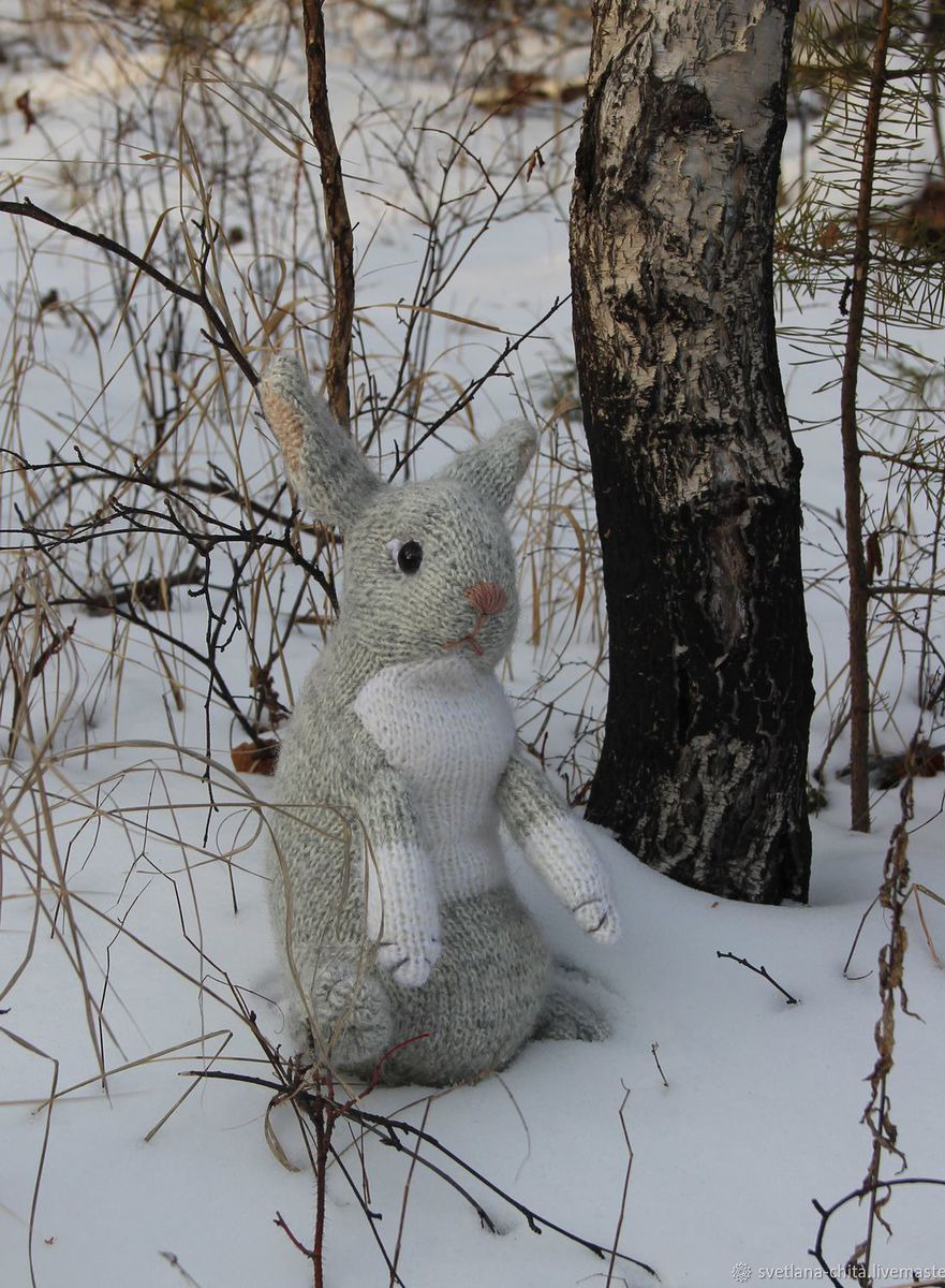 Наполнитель - синтепух. Глазки - пластмассовые. Размер зайца вместе с ушками примерно 30 см. Необычная мягкая игрушка порадует и ребенка, и взрослого. Такой зайчик может стать украшением детской комнаты, спальни или гостиной.