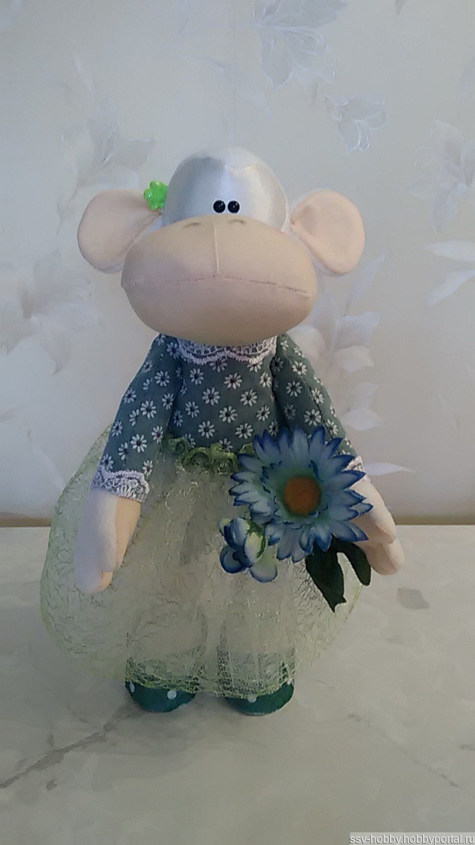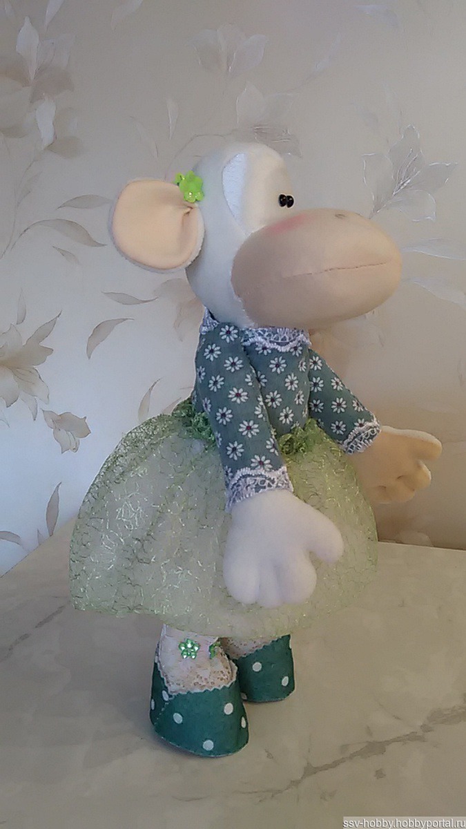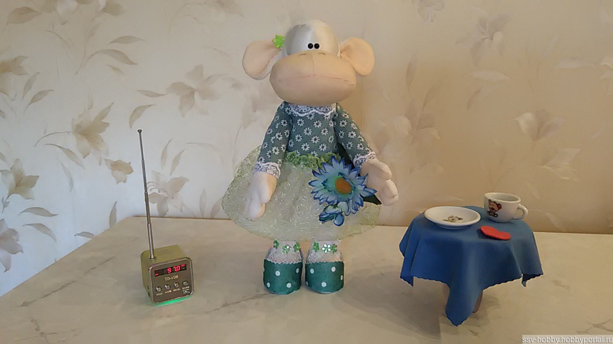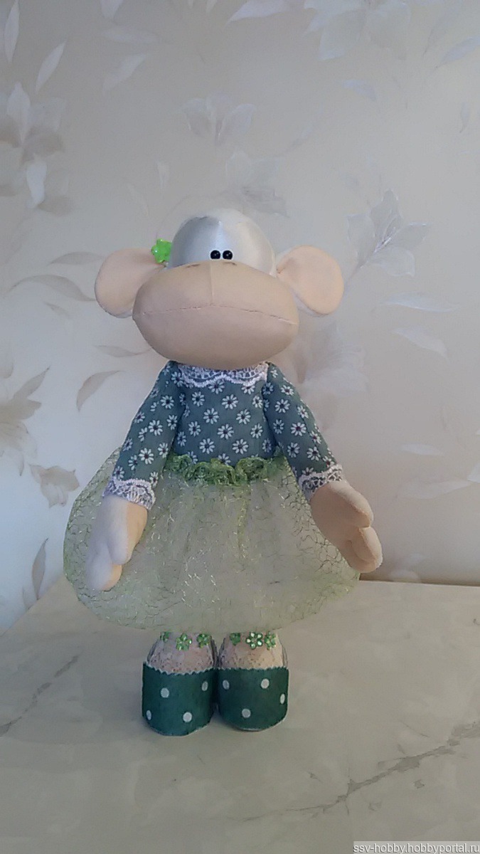 Текстильная куколка, умеет сама стоять и сидеть. Выполнена из трикотажной ткани и флиса, наполнение - гипоаллергенный наполнитель. Одежда сшита из рубешечной ткани и сетки-клеточка, обувь из фетра. Рост куколки 33 см.