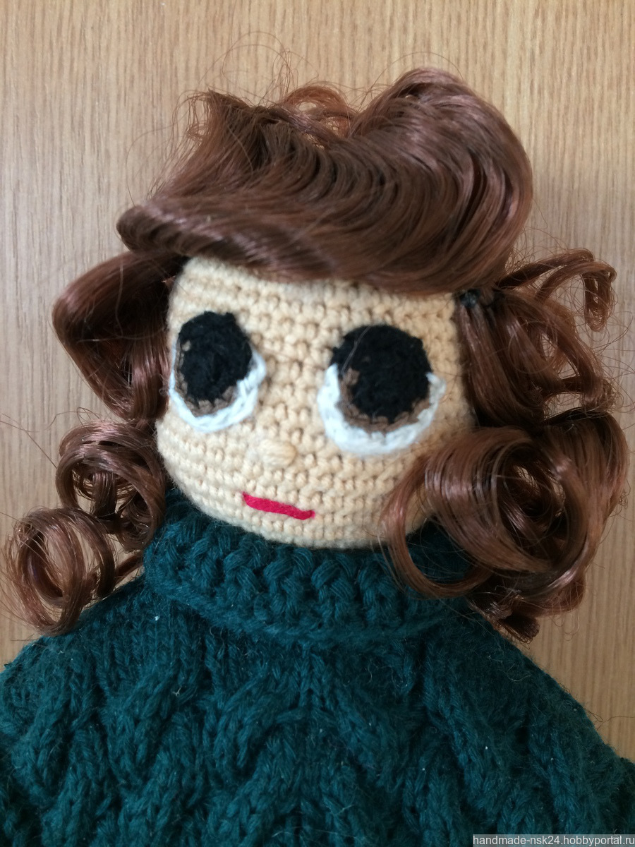 Кукла мальчик , ручной работы. Связан из безопасных материалов. Брюки джинс, тёмно синего цвета. Волосы искусственные, тёмно-коричневого цвета.