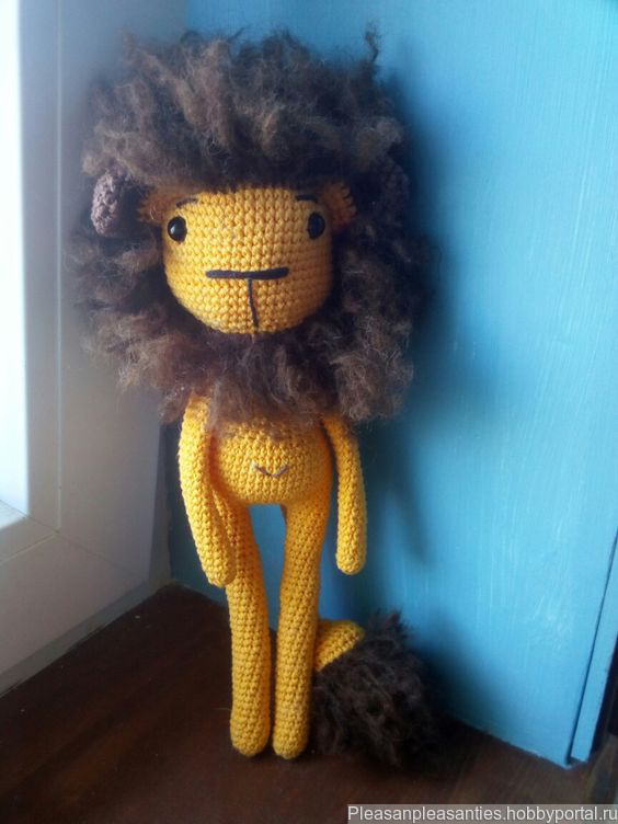 Лев по имени Той оригинален по своему исполнению: связан полностью из хлопка, а грива и конец хвоста - из буклированной шерсти альпаки и начёсан (так что можно аккуратно расчёсывать гриву Лео Тоя). Грива только по периметру головушки. Глазки на безопасном креплении.